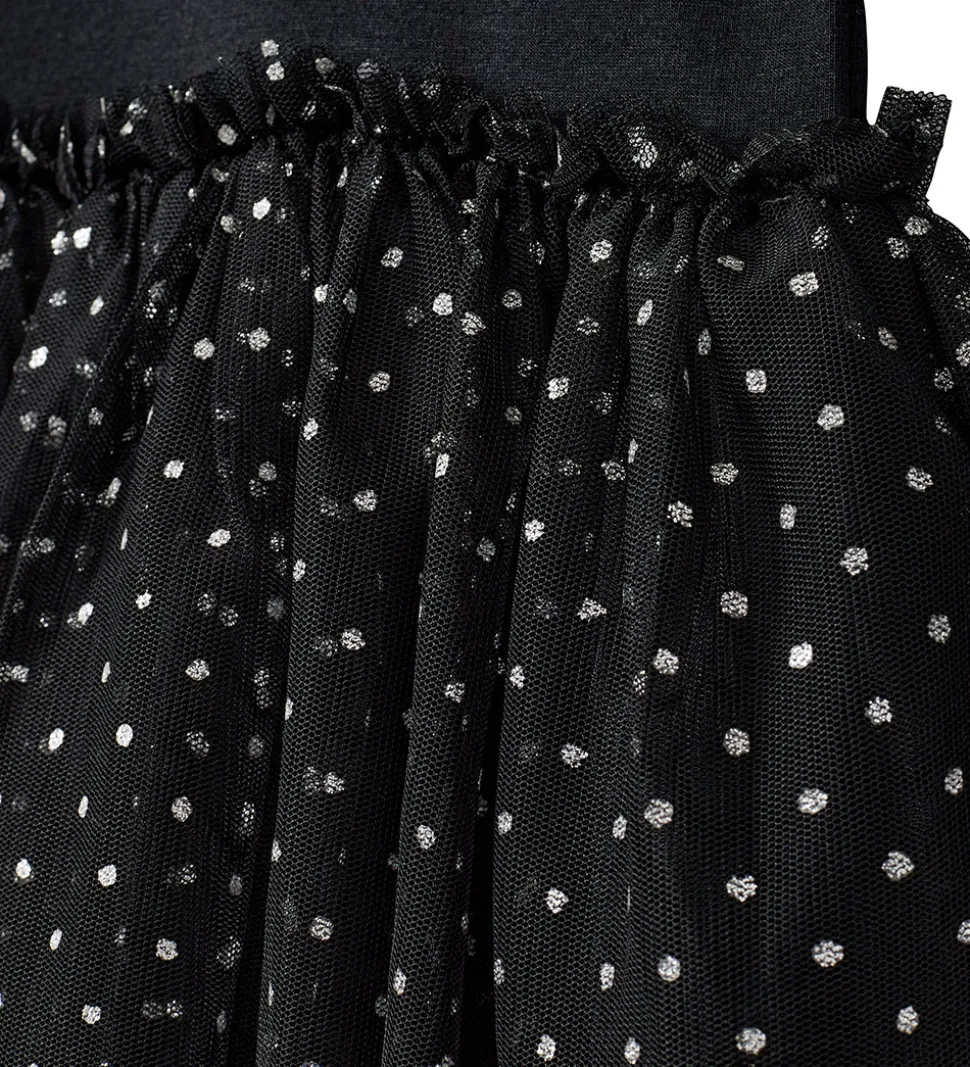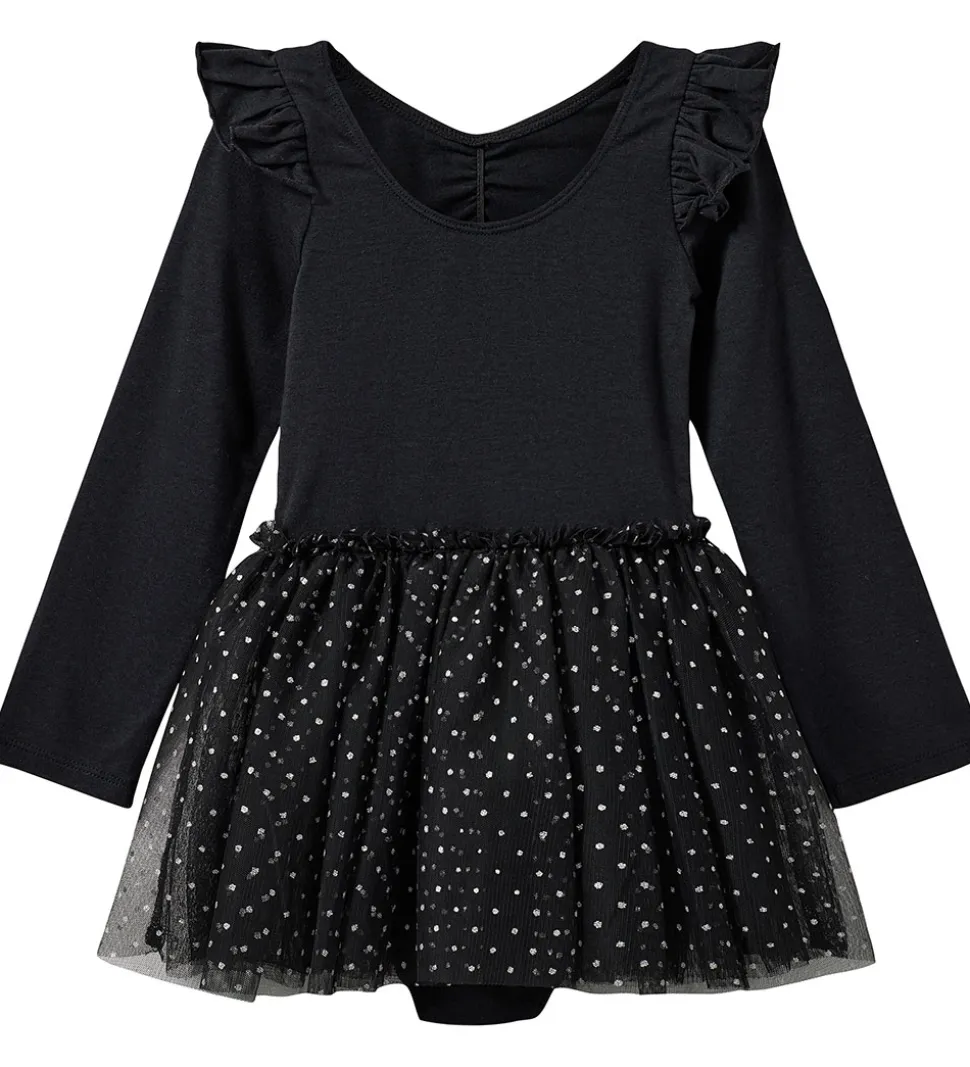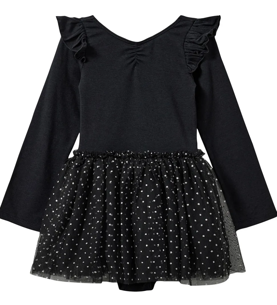Elegant Sofie Schnoor gymnastikdragt med lange ærmer i sort. Dragten har søde flæser ved skuldrene og en flot tylnederdel med glitrende detaljer, perfekt til leg og dans.