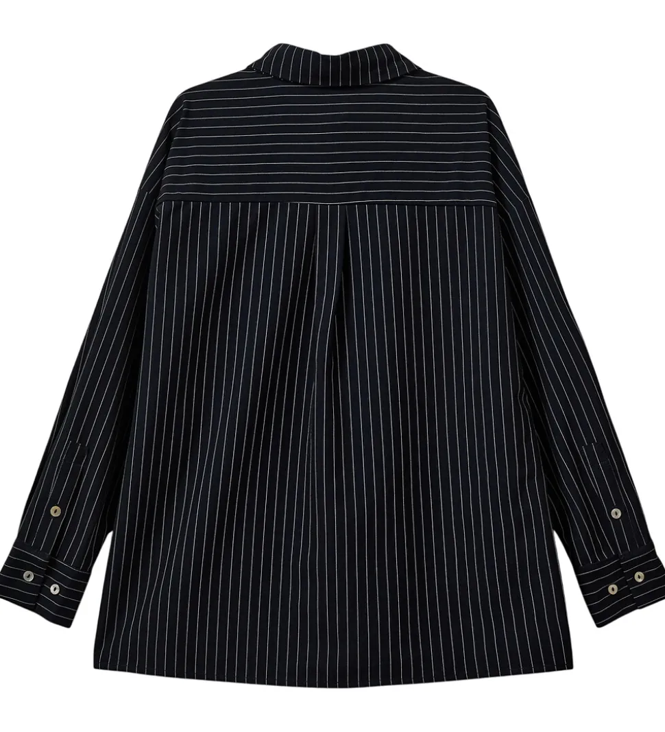 Stilfuld Sofie Schnoor skjorte med lange ærmer og en klassisk krave. Skjorten har et tidløst design med smalle hvide striber på en navy baggrund. Den er udstyret med en enkelt brystlomme, der tilføjer en ekstra detalje til det enkle udtryk. Skjorten har en løs pasform, hvilket ses i den afslappede silhuet.
