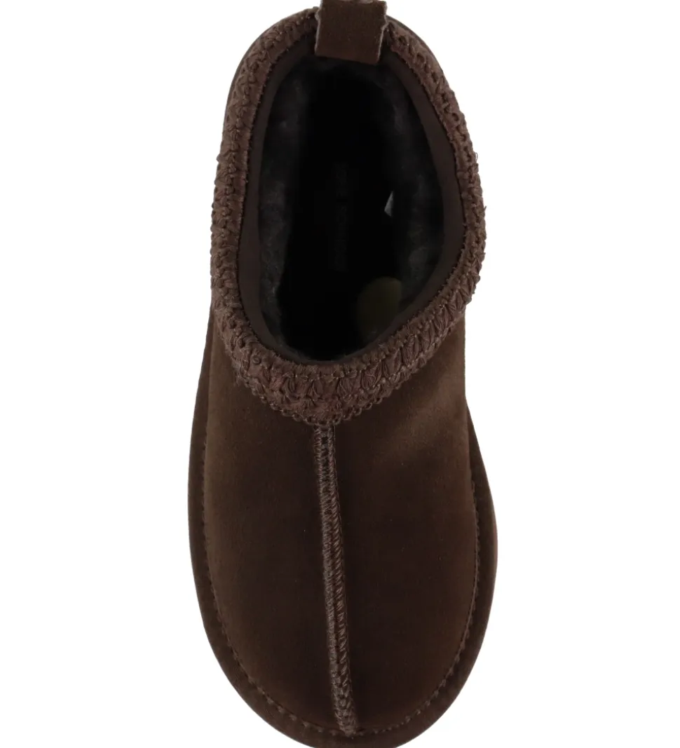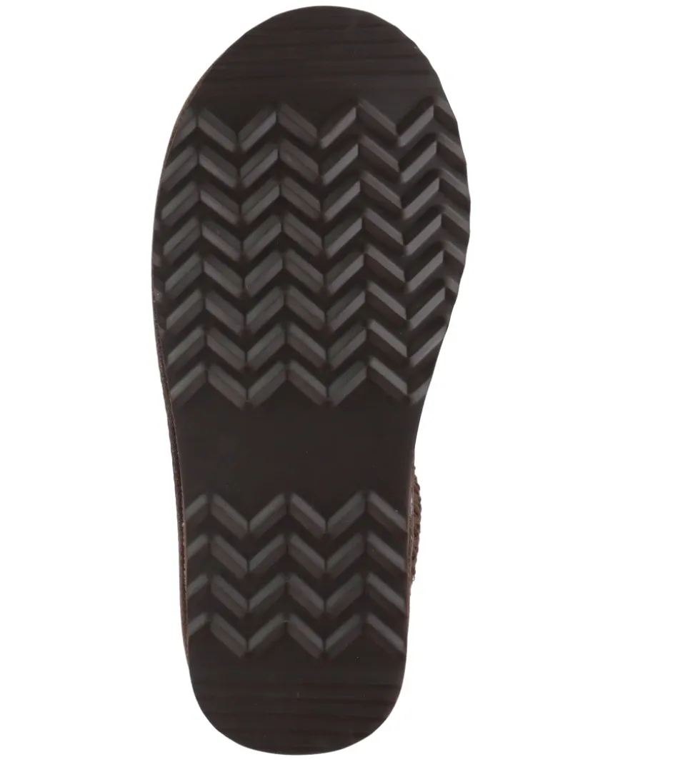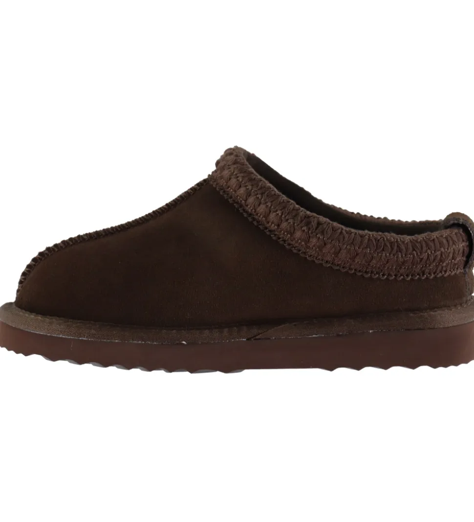 Skoene er lige til at hoppe i, og har en lav hælkappe med en praktisk strop. Indvendigt er de forede med mørkebrunt, imiteret pels. Ydersålerne er letvægtige og har et praktisk skridmønster under bunden, som sikrer et godt fodfæste.