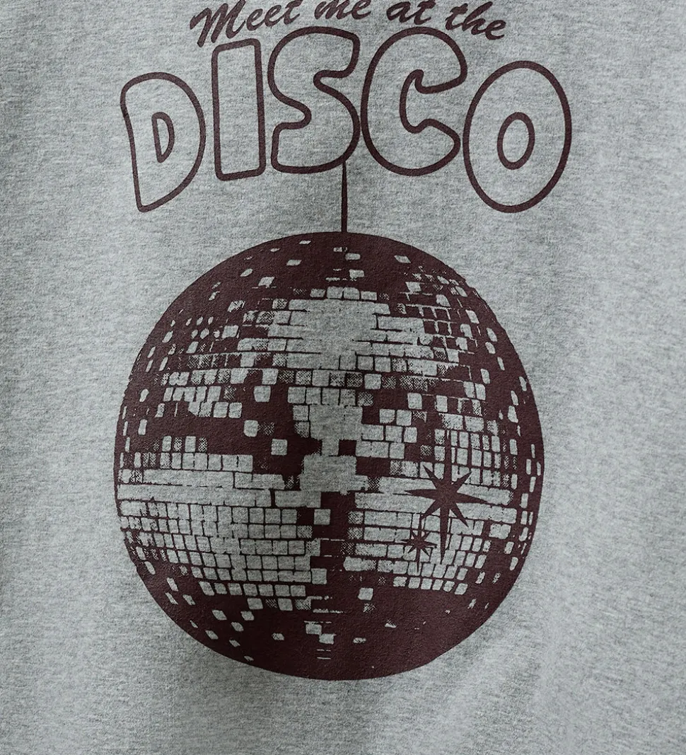 Smart Sofie Schnoor sweatshirt i gråmeleret med et iøjnefaldende disco-tema. Sofie Schnoor sweatshirten har lange ærmer og en rund hals. Foran ses et print med teksten “Meet me at the DISCO” over en stor diskokugle i mørk nuance.