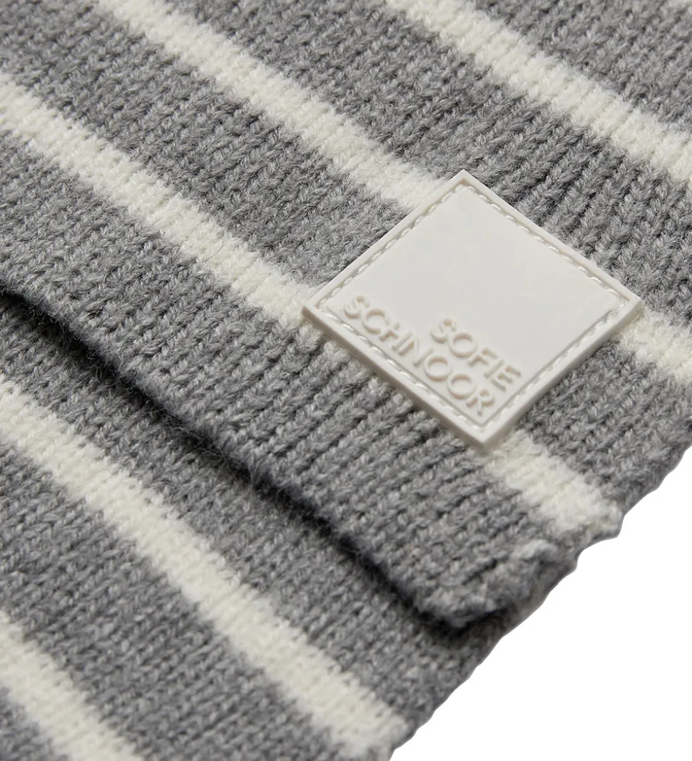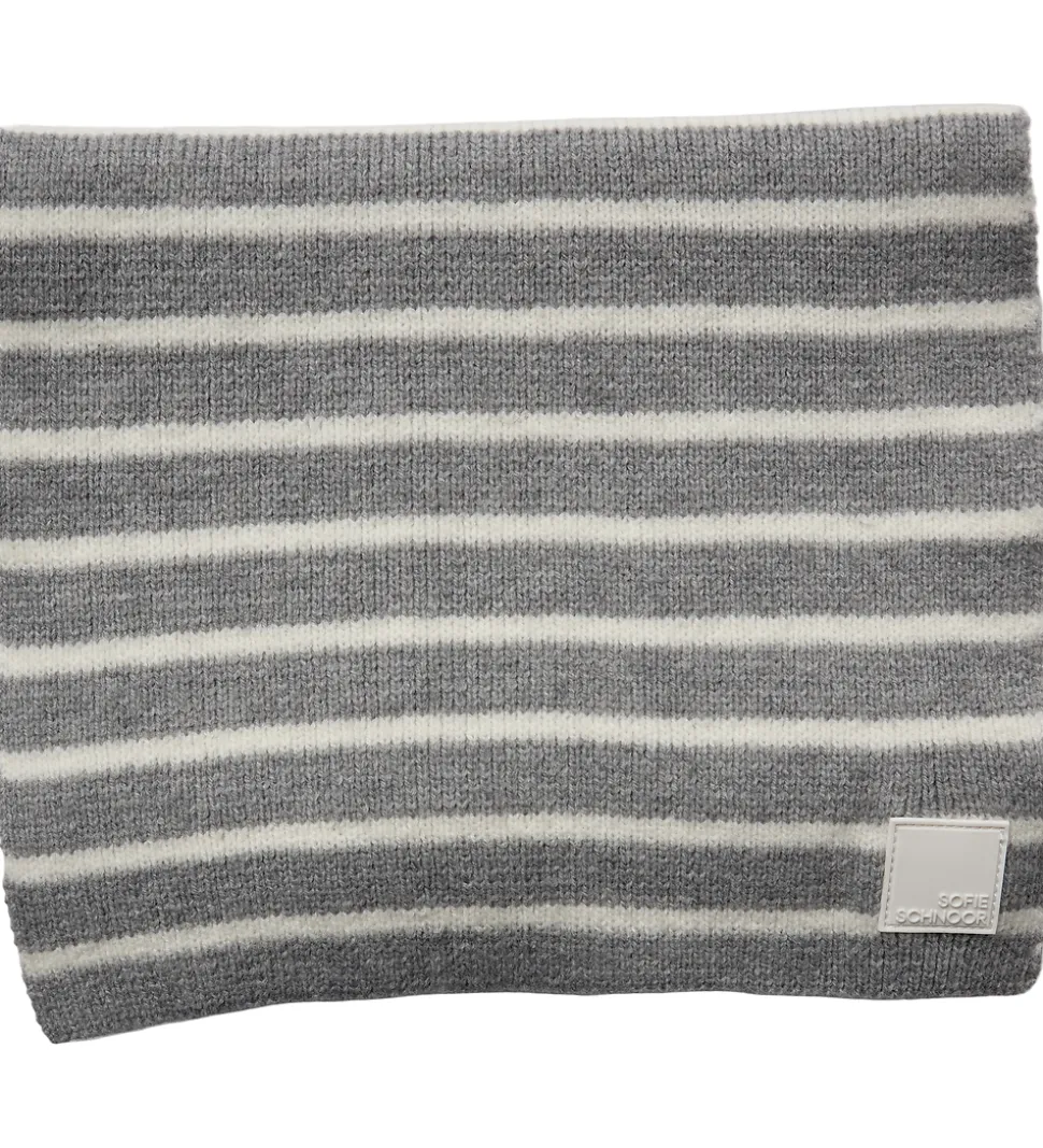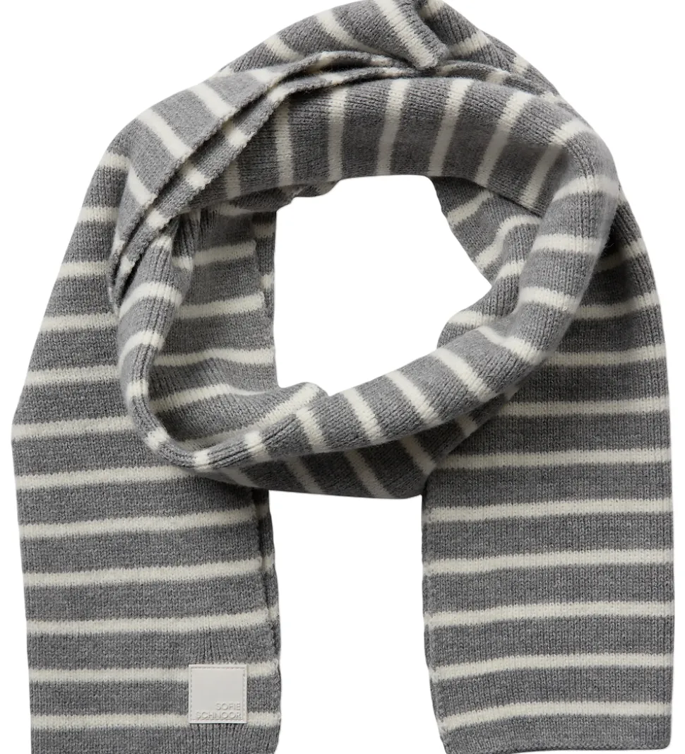 Stilfuldt Sofie Schnoor tørklæde i meleret grå med smalle, hvide striber. Sofie Schnoor tørklædet har et sofistikeret stribedesign, der tilføjer et klassisk touch til enhver garderobe.