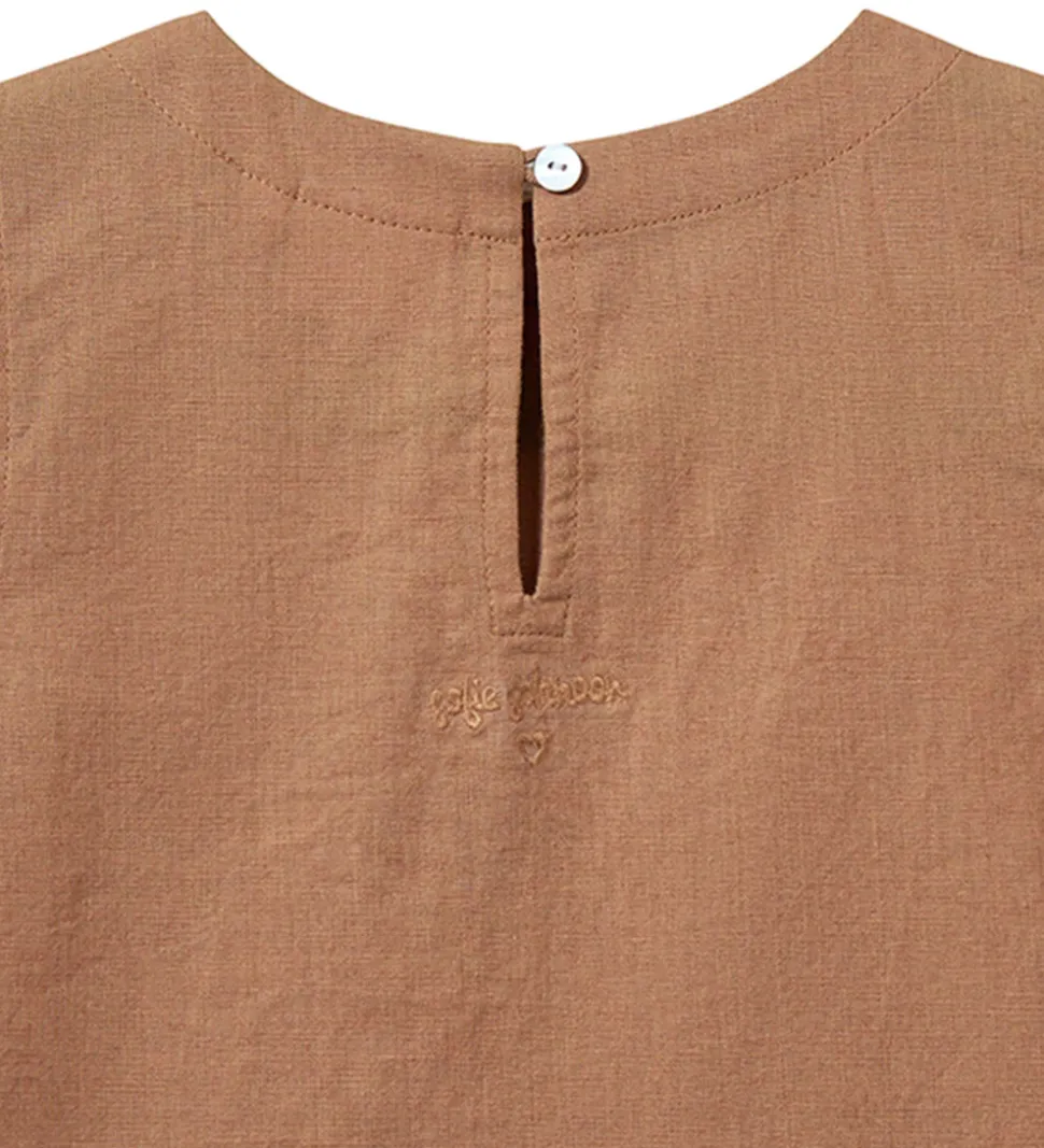 Smuk Sofie Schnoor top i en skøn rødbrun nuance og med dekorative fastsyede sløjfer i siden.