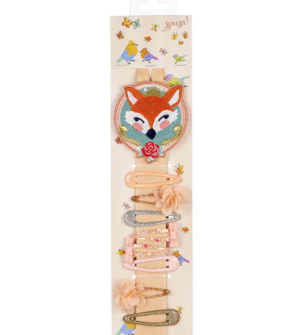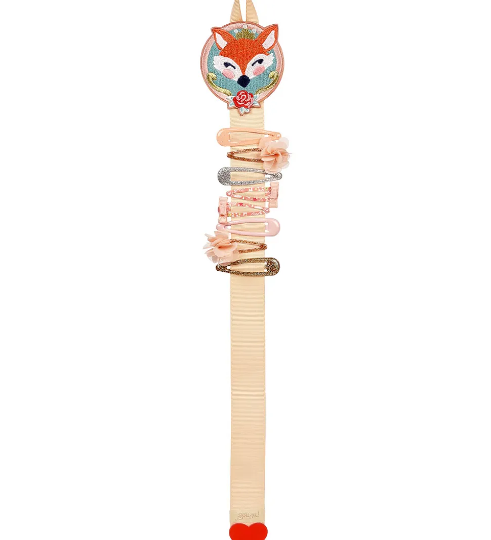 Flotte Souza hårspænder solgt som en 8-pak sammen med en praktisk ophængsstrop med en ræv. Hårspænderne er i et rosa farvetema med detaljer i form af både glimmer, blomster og sløjfer.