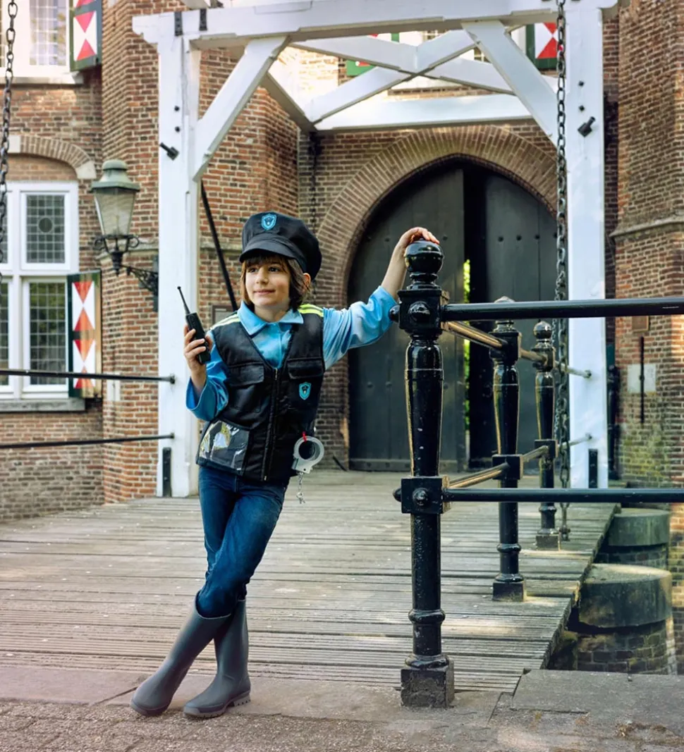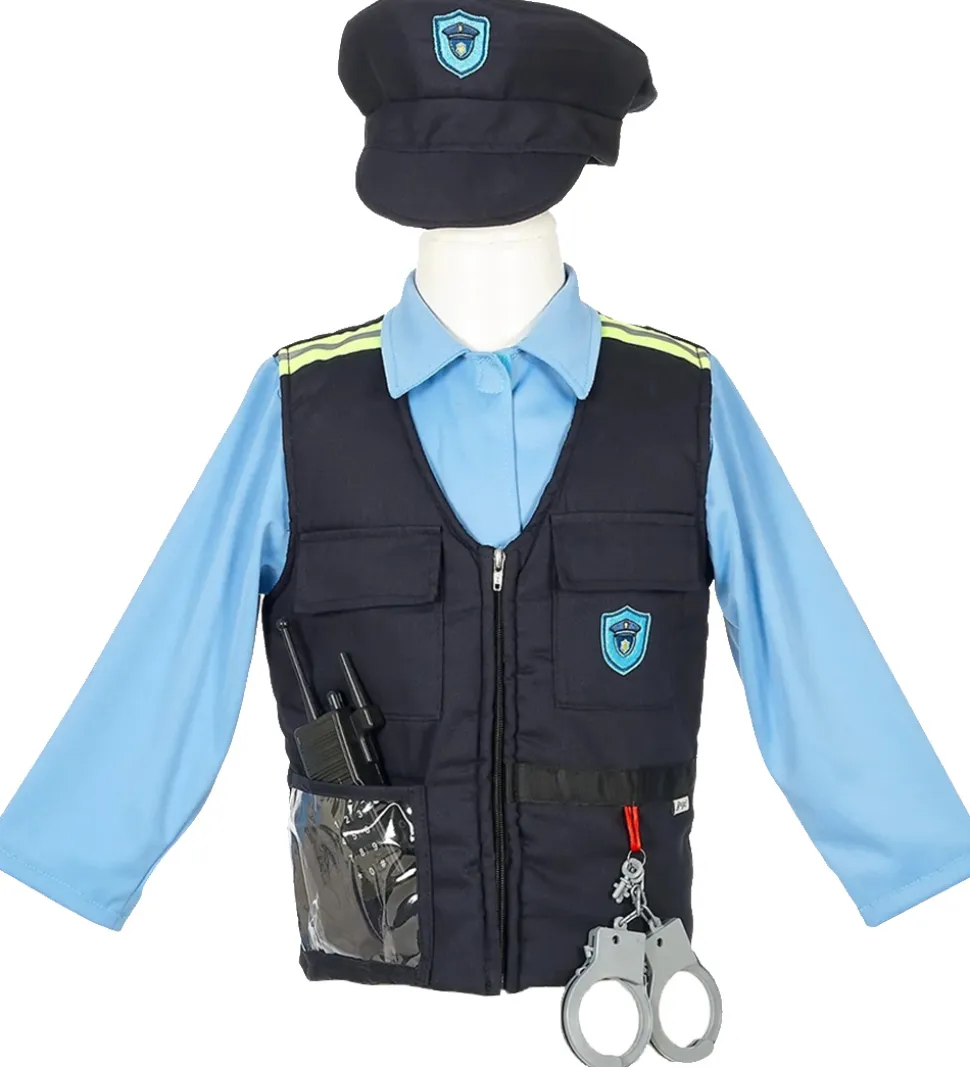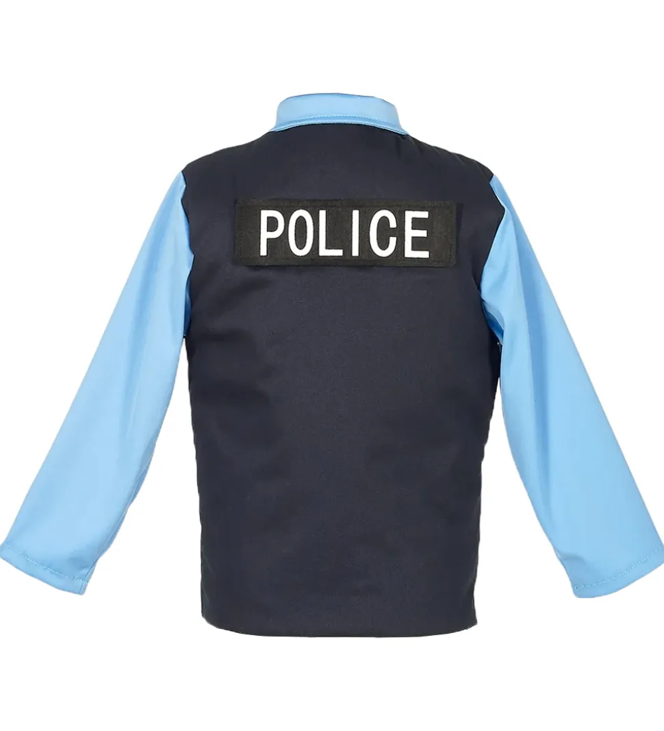 Souza udklædningen er i lyseblå og navy, og politmærkerne tages af og på med velcro. Der medfølger politimærker på engelsk, tysk og spansk.