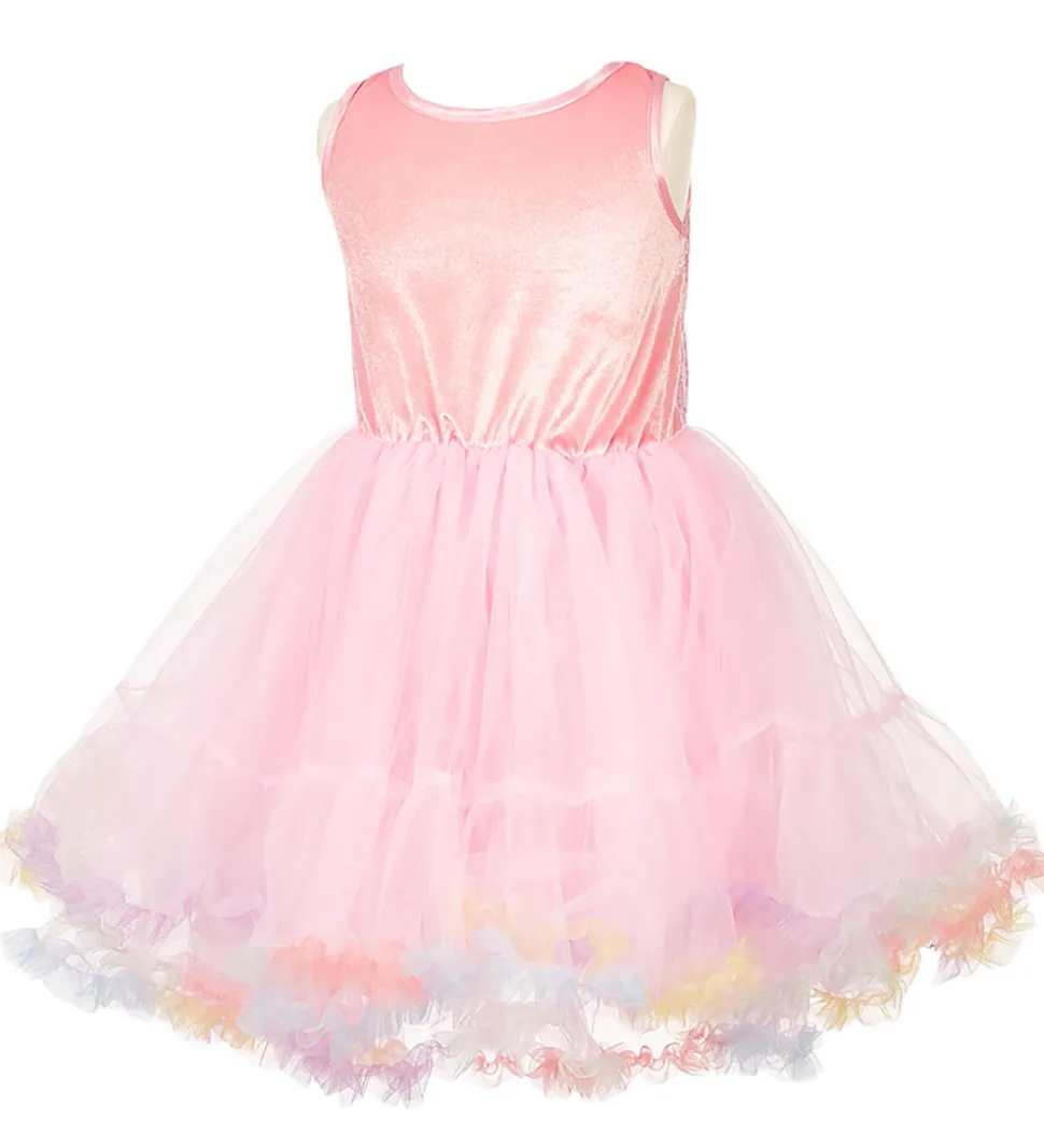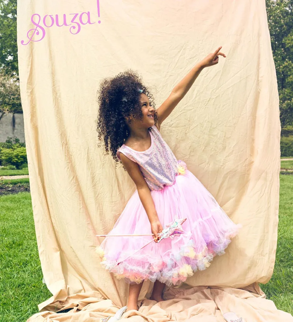 Souza udklædningen er rosa med tyl, pailletter og multifarvede detaljer såsom en blomst ved hoften.
