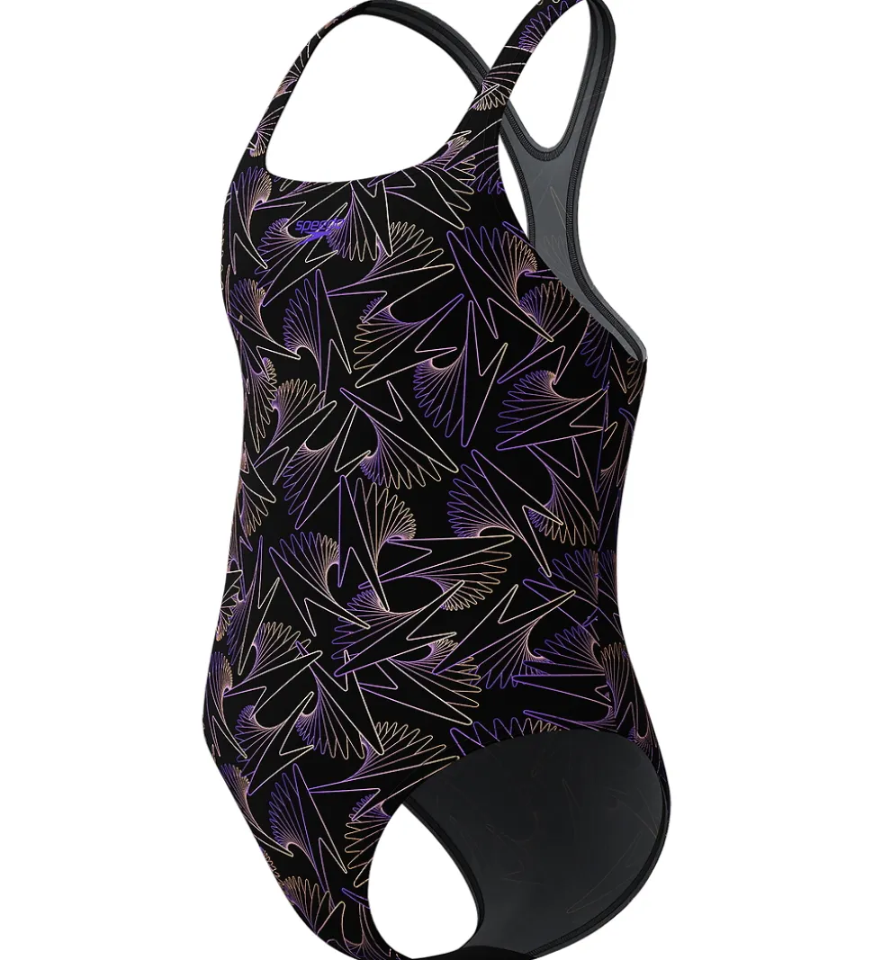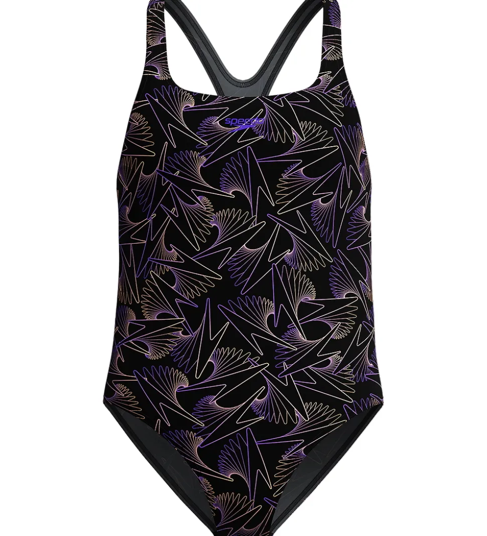 Flot Speedo badedragt i sort, og i siderne og på stropperne er der et flot mønster i lilla og rosa nuancer.