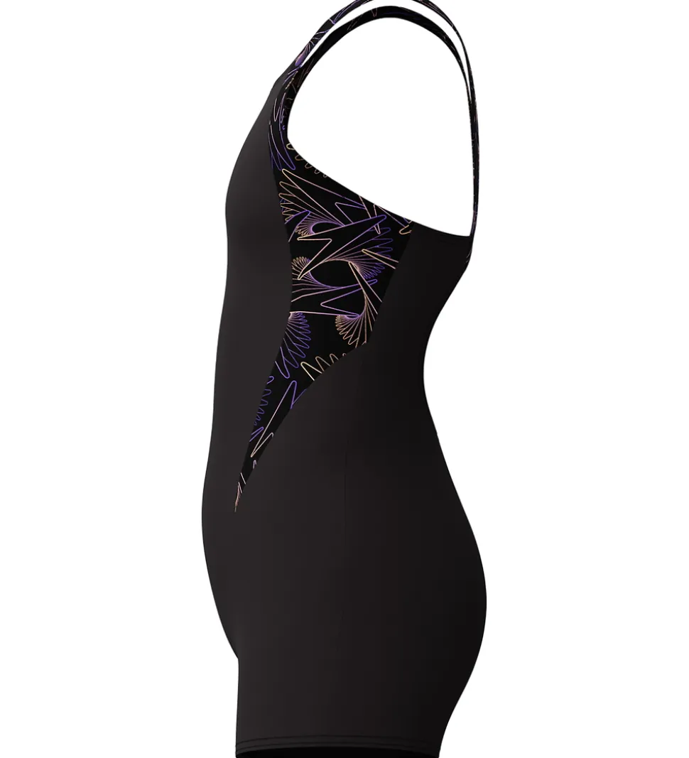 Flot Speedo badedragt i sort, og i siderne og på stropperne er der et flot mønster i lilla og rosa nuancer.