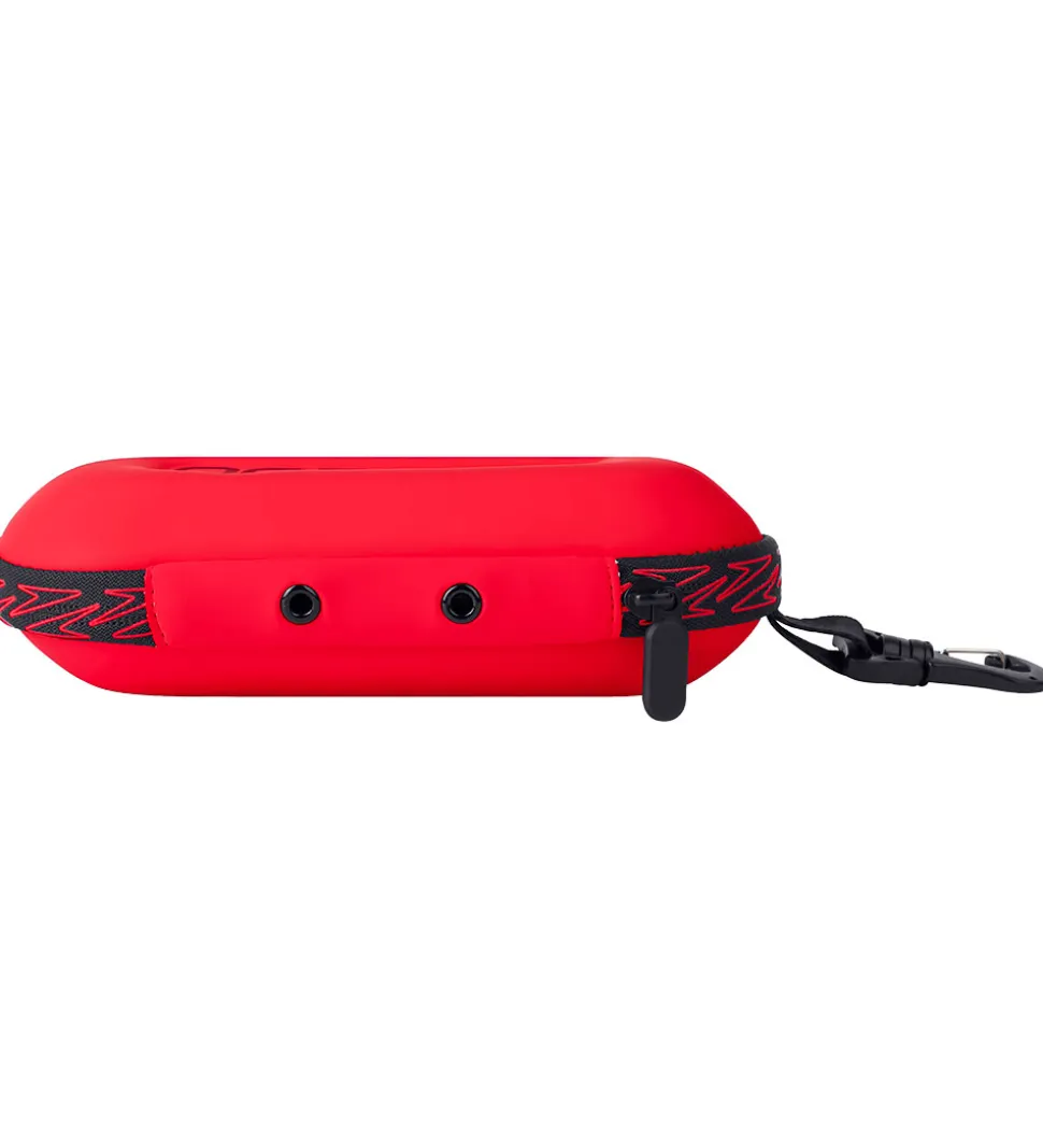 Udenpå sidder der i den ene ende en karabinhage, der nemt kan sættes fast på tasken. Derudover er der praktiske drænhuller, så der ikke fanges vand inde i svømmebrilleetuiet.