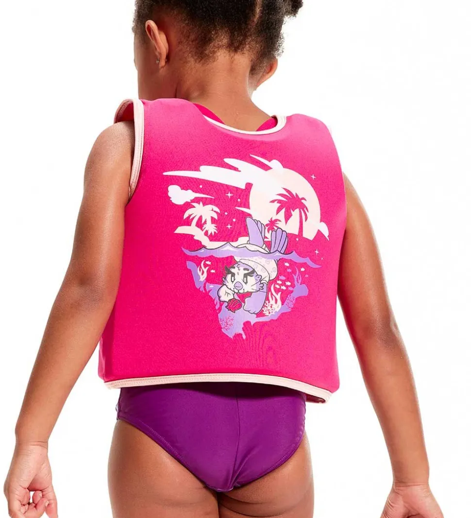 Lækker Speedo svømmevest i mørk rosa med print af en odder på ryggen og i venstre side fortil. Der er lilla og rosa kanter.