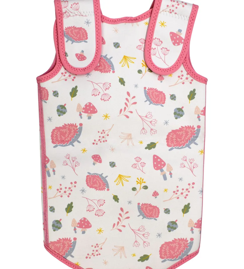 Splash About neoprendragten er uden ærmer og har brede skulderstropper. Neoprendragten åbnes med brede velcrostropper på fronten og mellen benene, så den er let at få på og af. Den er fremstillet i 2mm tykt neopren, som sikrer at de små holder godt på varmen.