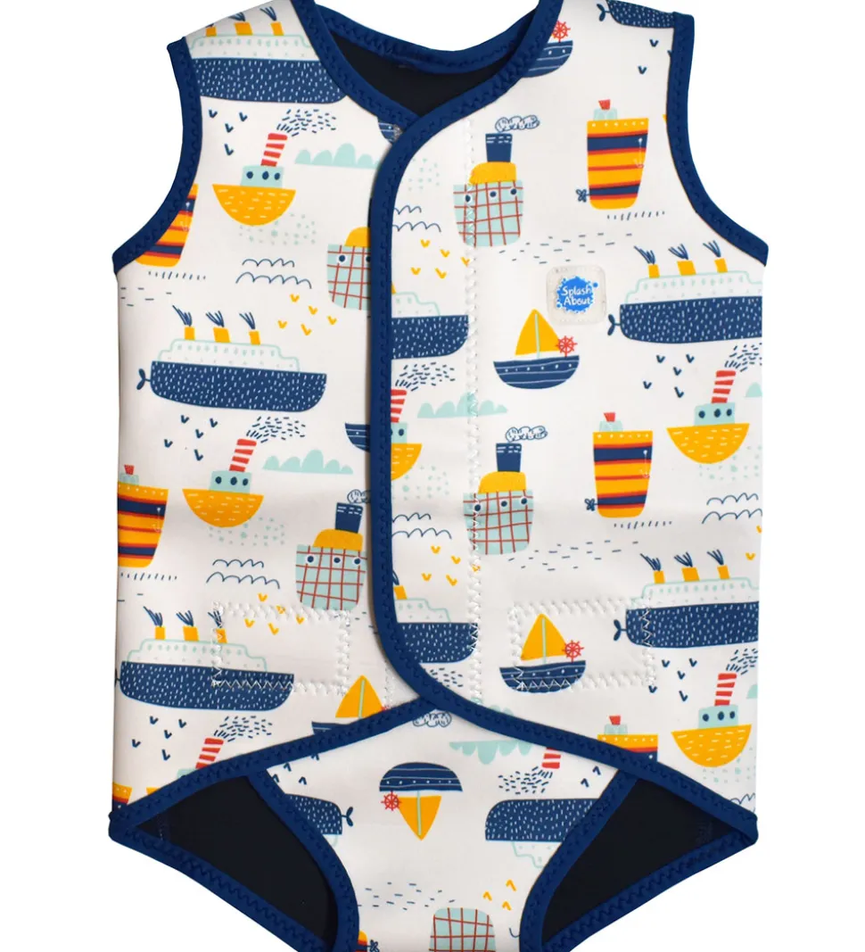 Splash About neoprendragten er uden ærmer og har brede skulderstropper. Neoprendragten åbnes med brede velcrostropper på fronten og mellen benene, så den er let at få på og af. Den er fremstillet i 2mm tykt neopren, som sikrer at de små holder godt på varmen.