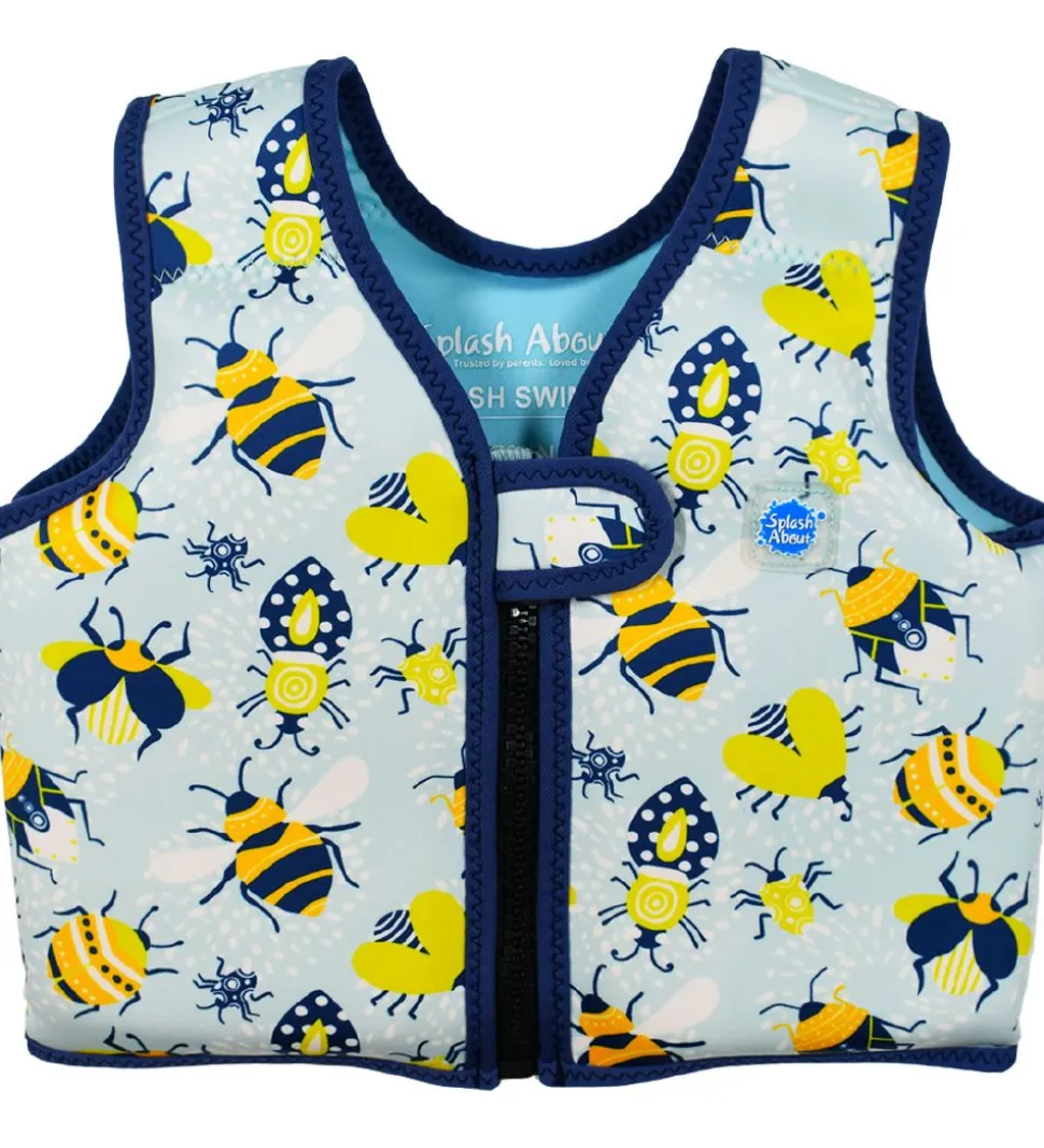Skøn Splash About svømmevest i lyseblå med navy kanter. Svømmevesten er med allover print af insekter i gul, orange og navy. På venstre bryst er der et logo i gummi.