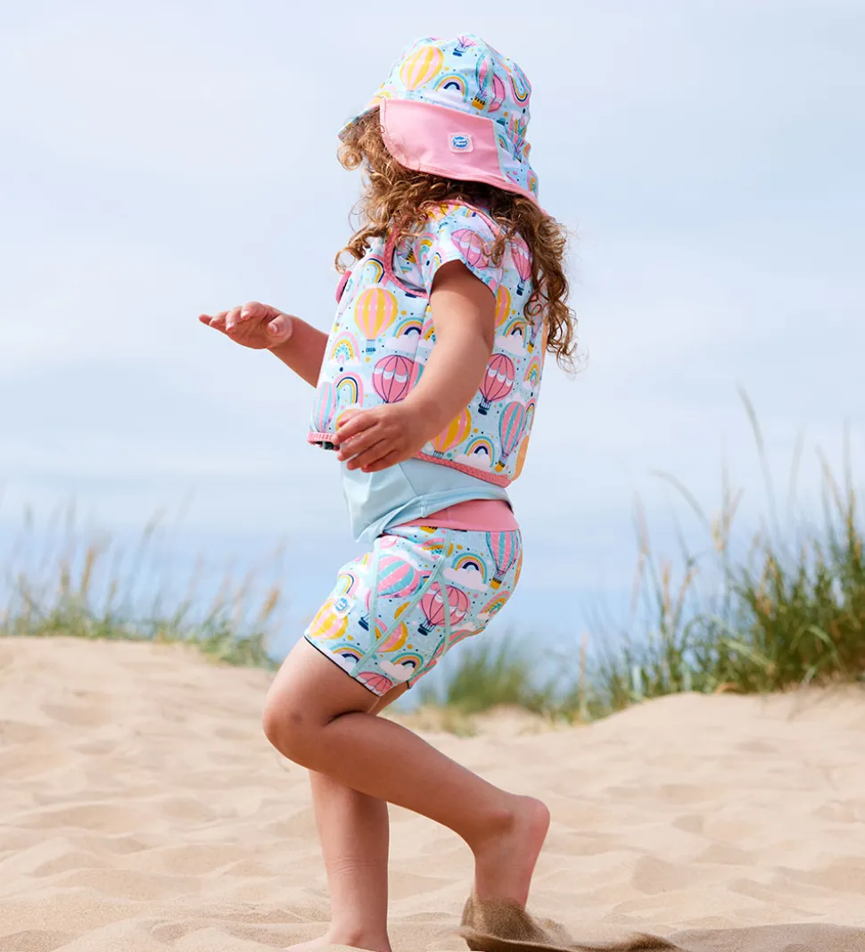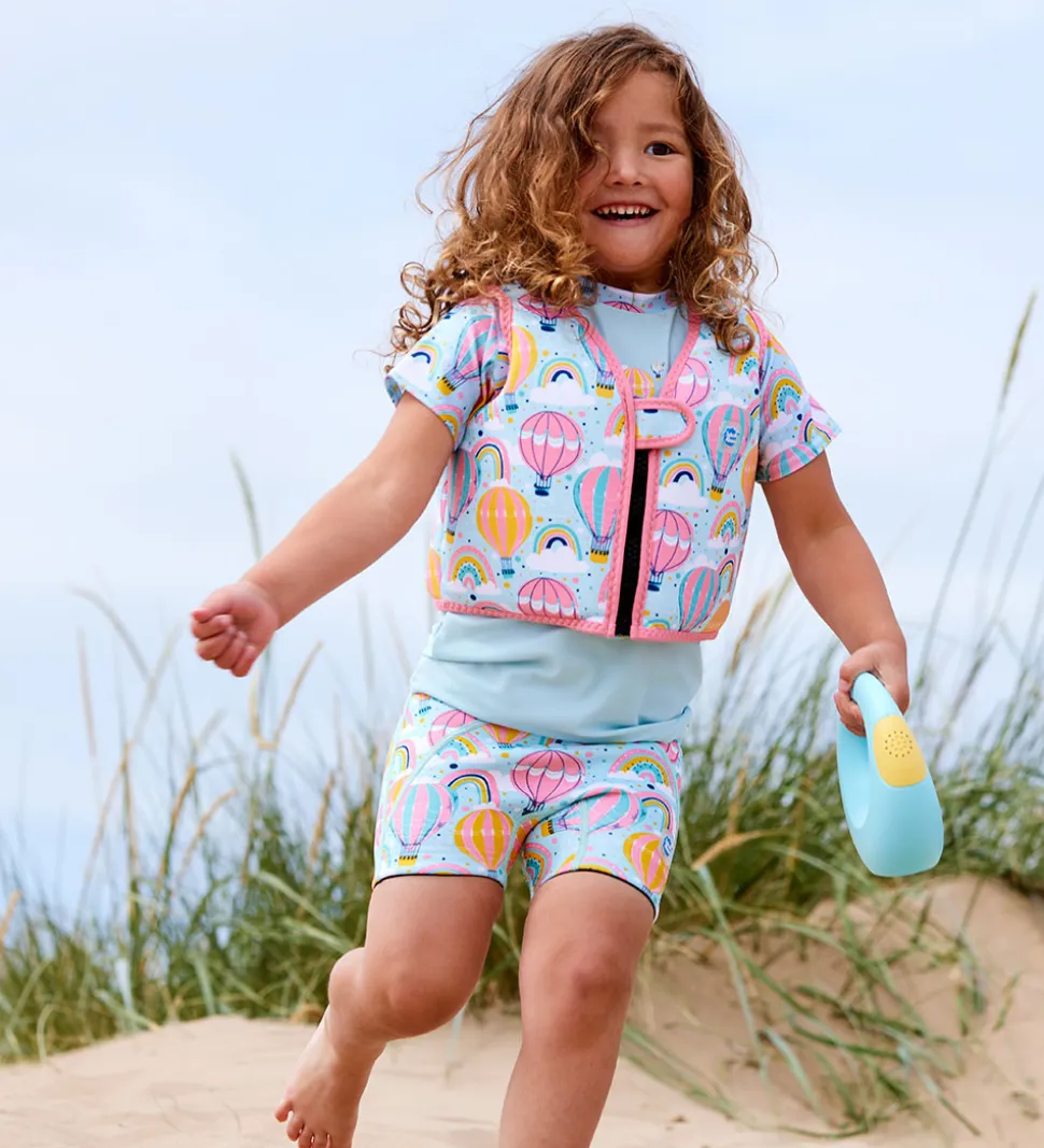 Skøn Splash About svømmevest i lyseblå med rosa kanter. Svømmevesten er med et print af flotte luftballoner og regnbuer i flotte farver. På venstre bryst er der et logo i gummi.