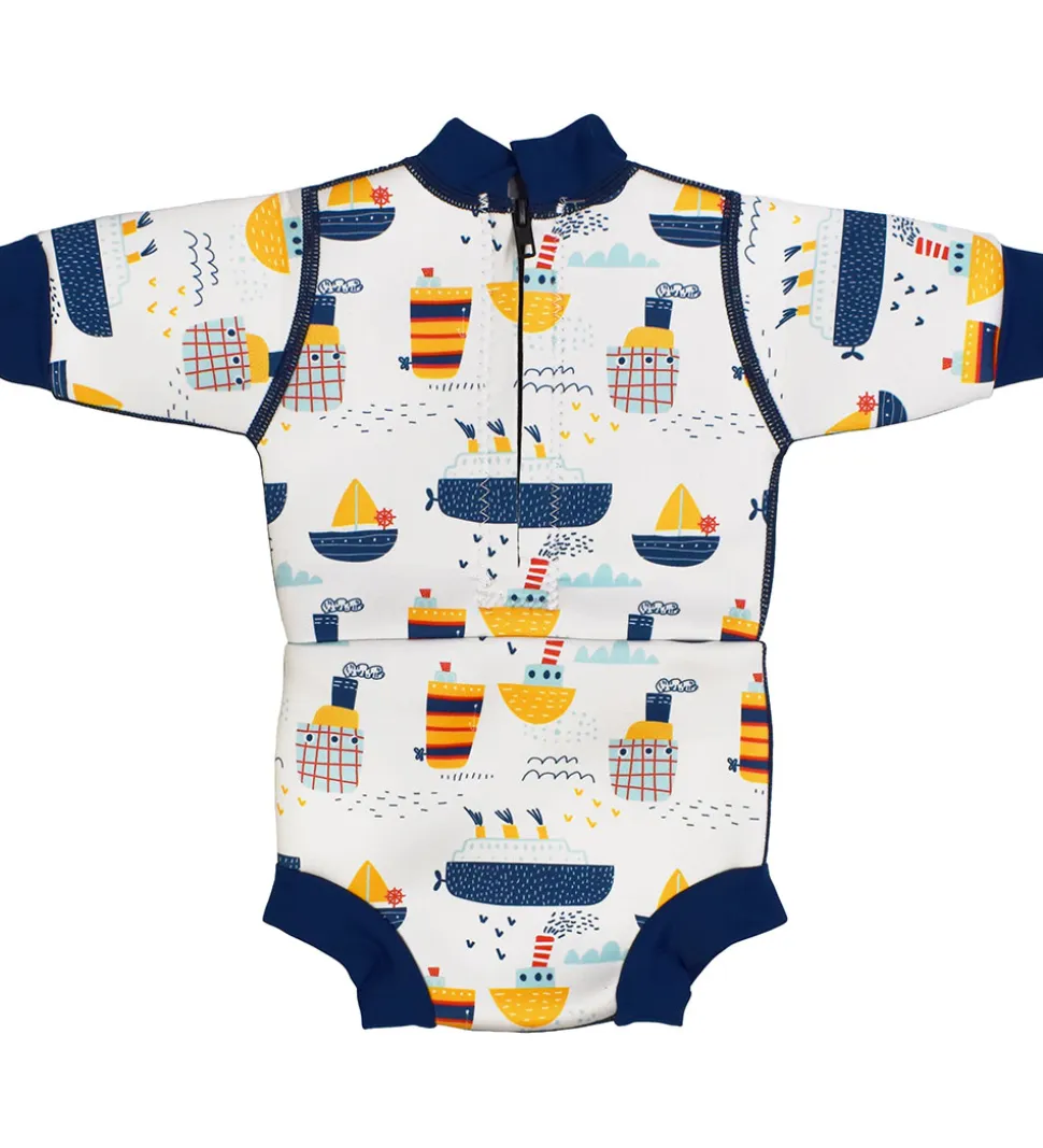 Smart Splash About våddragt i hvid, med print af skibe og bølger m.m. i et hav af farver over det hele. Kanterne er blå.
