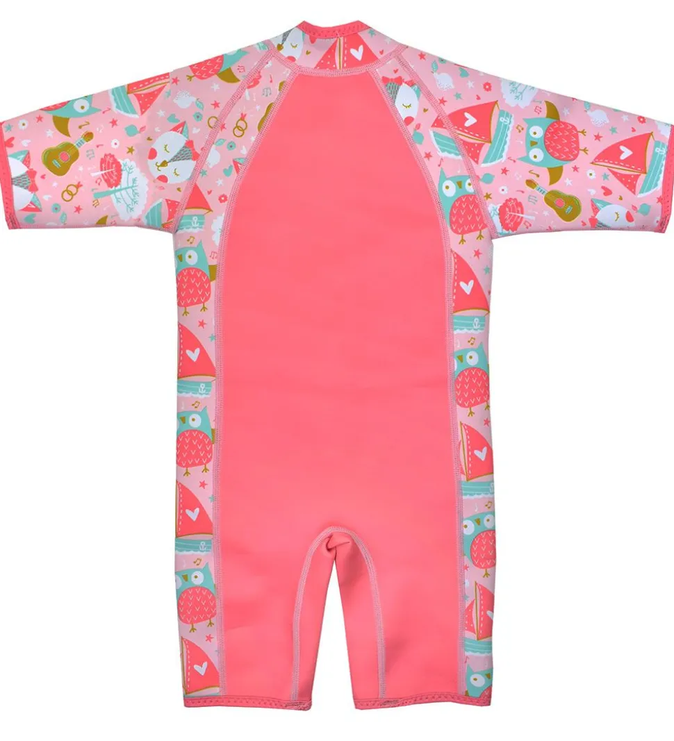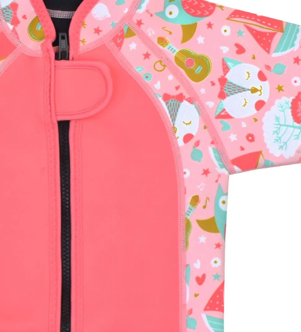 Smart Splash About våddragt i rosa med lyserosa ærmer og sider med et alloverprint af ugler og katte.