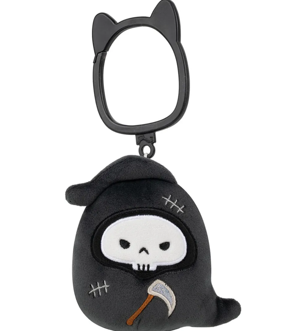 Skøn Squishmallows bamse i sort og hvid, som ligner manden med leen. I toppen er der en stor clips, så bamsen kan hænges fast på en taske eller lignende. Bamsen er super blød at røre ved.