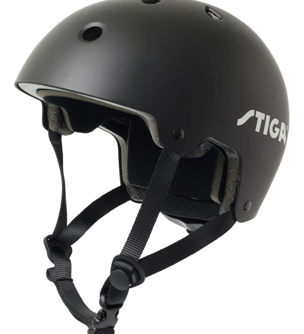 Stiga hjelmen spændes under hagen med et klikspænde og har justerbare remme. Hjelmen kan justeres i nakken med en drejeanordning.