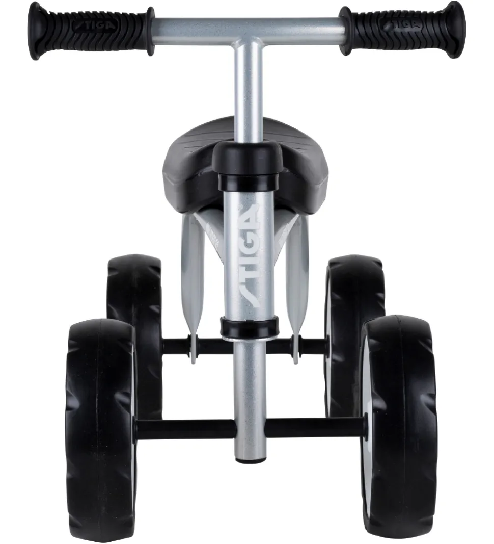 Lækker Stiga løbecykel med fire hjul i en sølv stålramme.
