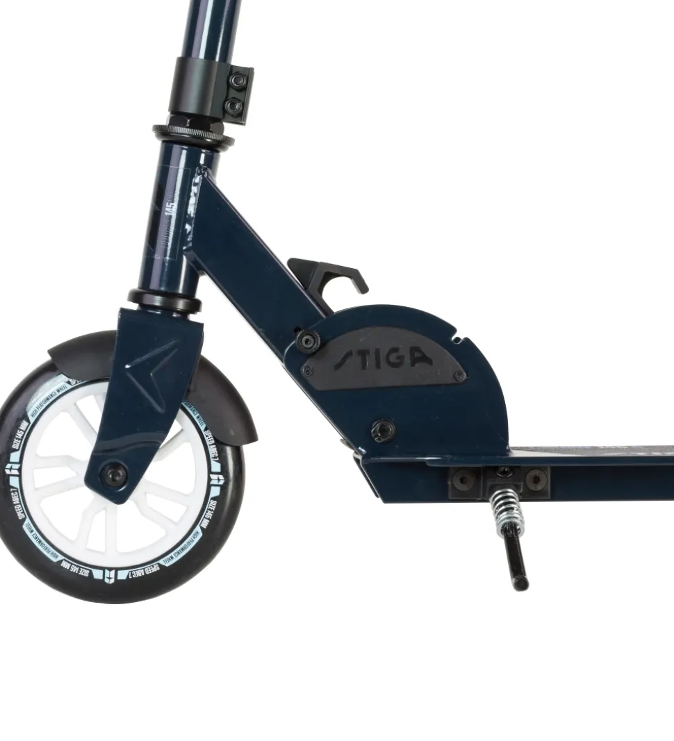 Smart Stiga løbehjul i en mørkeblå aluminium/stål-ramme, der kan foldes sammen.