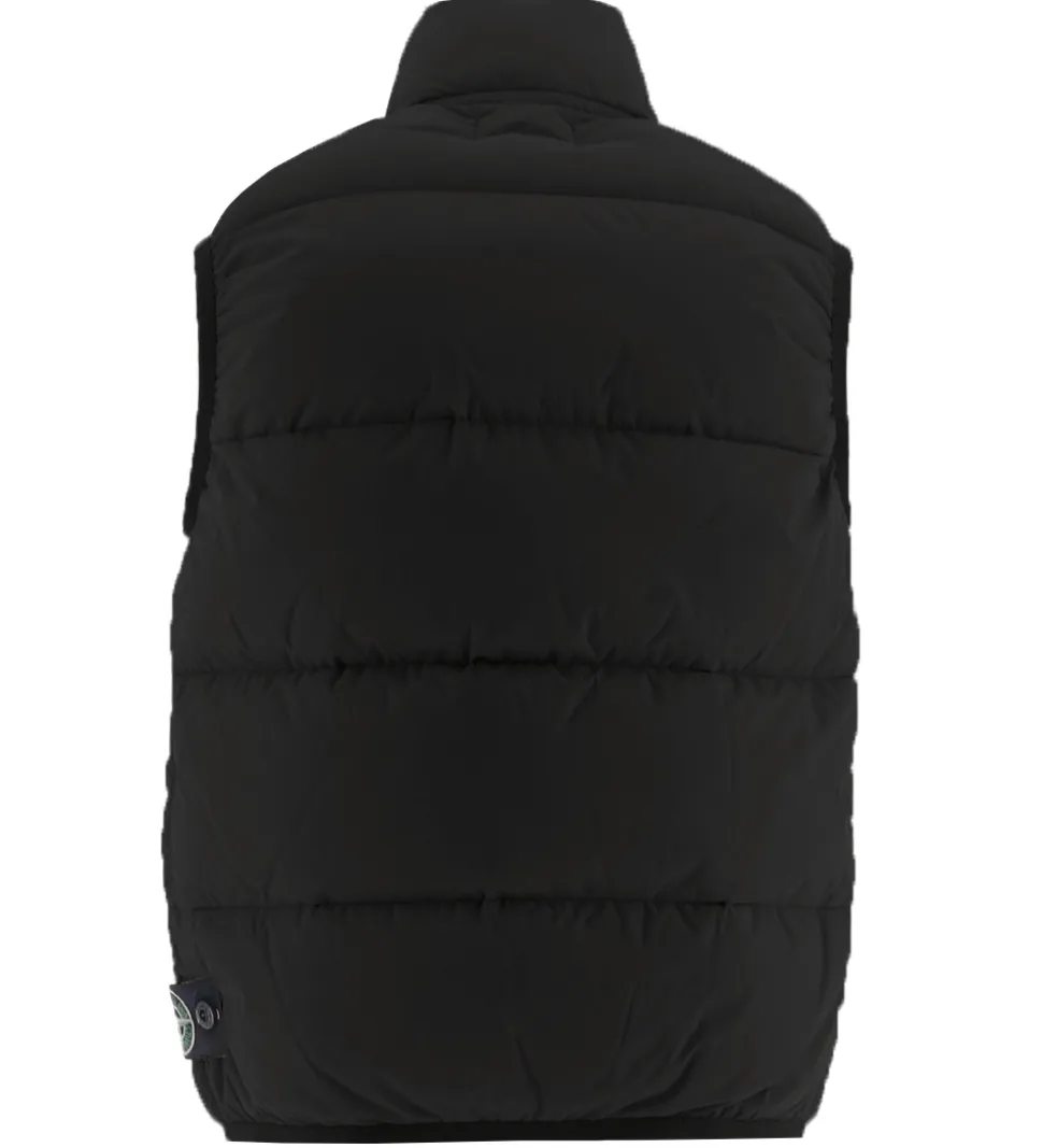 Lækker Stone Island dunvest i ensfarvet sort med dekorative bånd på skuldrene, og nederst i venstre side sidder det ikoniske logomærke fast med knapper. Dunvesten er lavet i glatvævet polyamid med vandrette syninger.