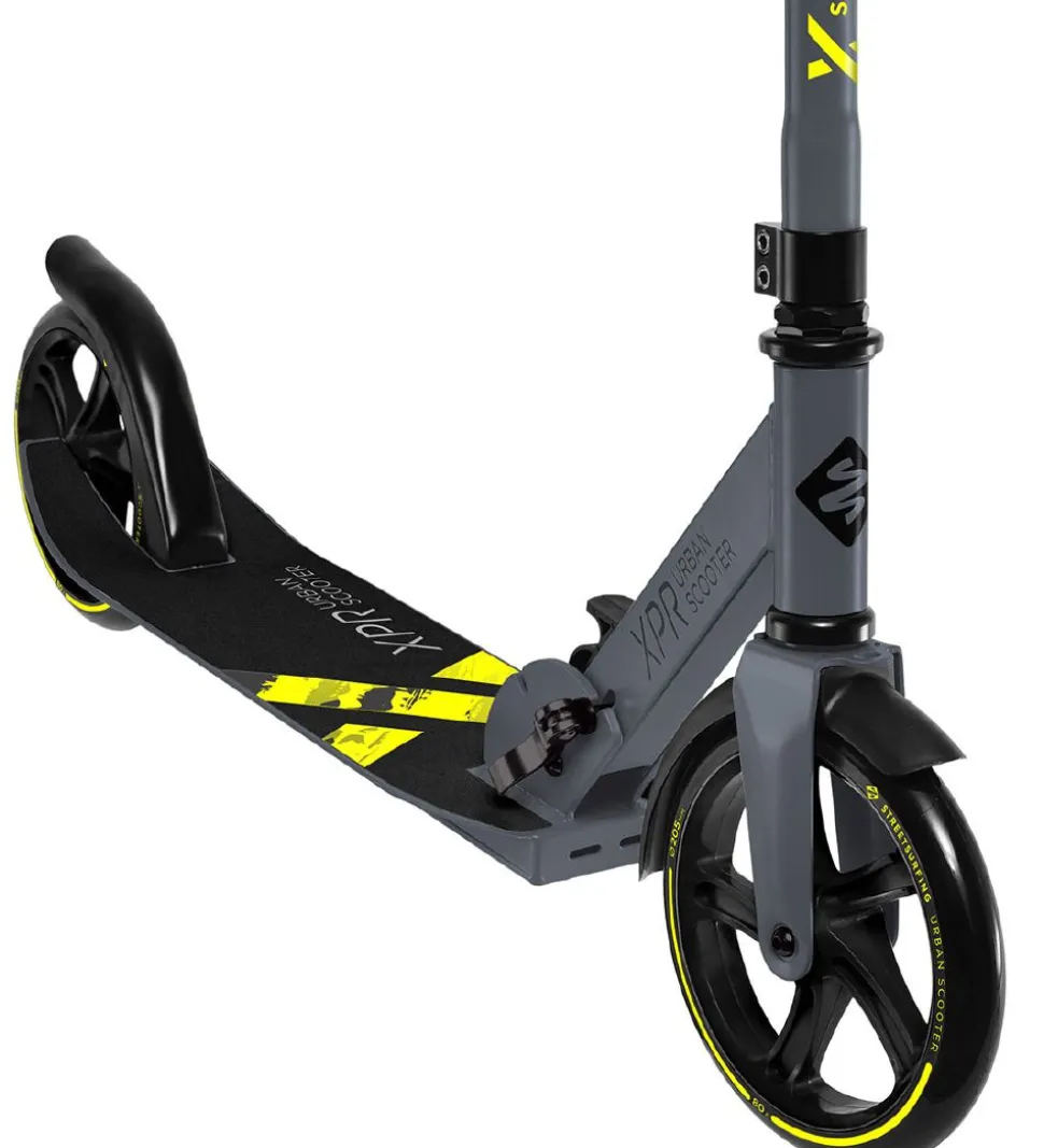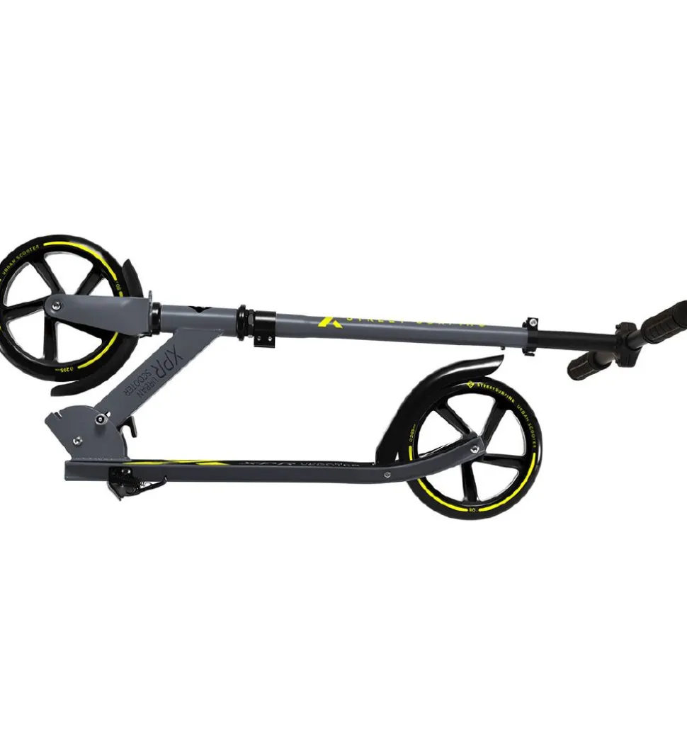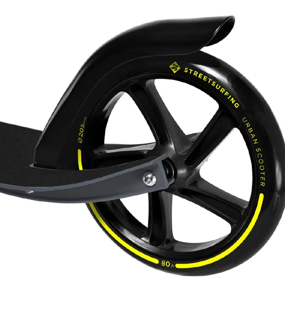 Sjovt Streetsurfing løbehjul i sort og grå med gule detaljer.