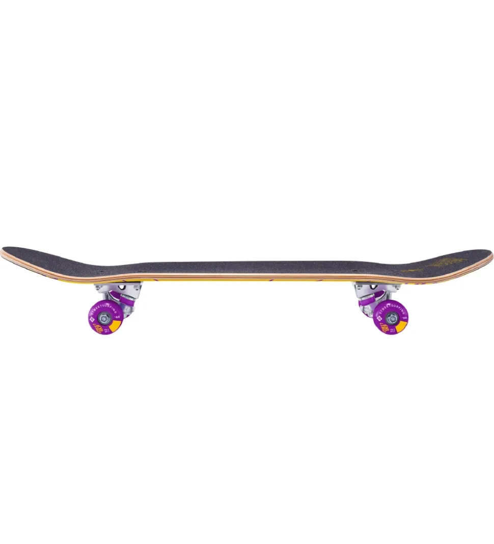 Flot Streetsurfing skateboard i sort på oversiden, og på undersiden er det gult med et øre i midten og med lilla detaljer.