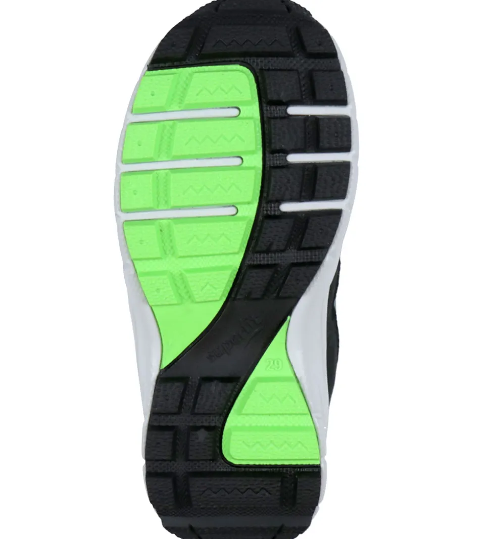 Smarte Superfit vinterstøvler i blågrønt tekstil med sorte detaljer i tekstil og imiteret skind. Vinterstøvlerne har neongrønne syninger og en neongrøn strop på hælen.
