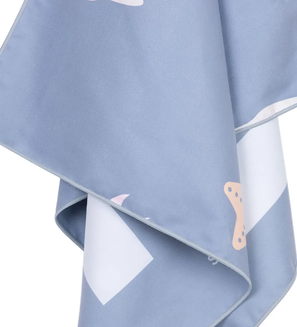 Flot Swim Essentials håndklæde i mikrofiber. På den ene side er der et stribet mønster i hvid og støvet blå og på den anden side er det blåt med print af en havskildpadde, små fisk, søstjerner og koraller. Håndklædet er letvægtigt, hurtigttørrende og kan foldes sammen, så det er praktisk at have med på farten.