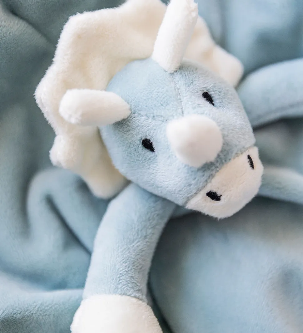Skøn Teddykompaniet nusseklud i lyseblå med hvid kant og en sød dinosaur i toppen.