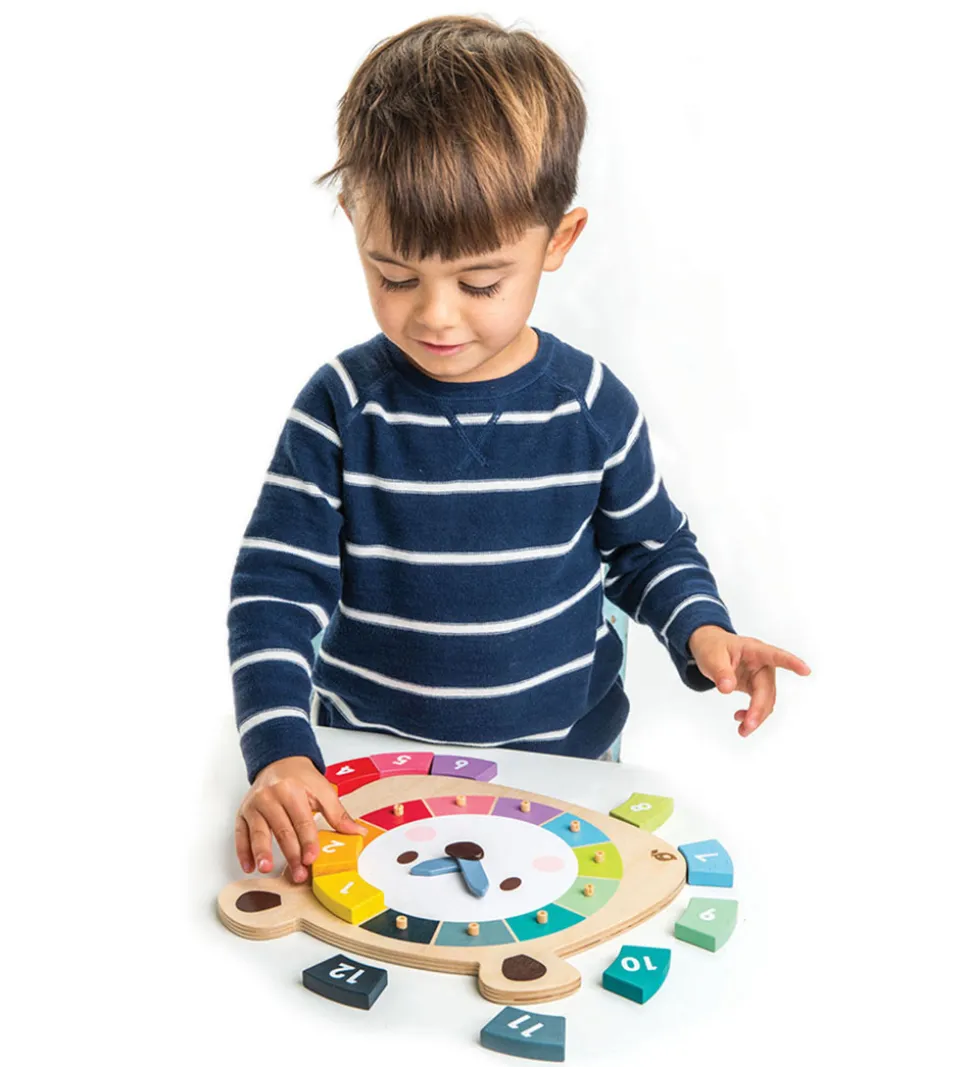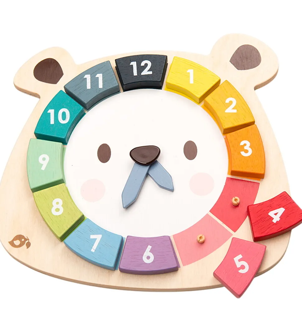 Charmerende Tender Leaf trælegetøj formet som en bjørn med et farverigt klokkedesign. Udforsk tallene fra 1 til 12 i nuancer af gul, orange, rød, grøn og blå, perfekt til læring og leg.