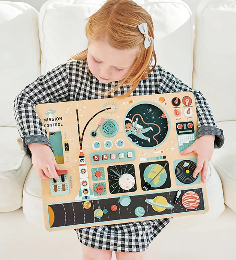 Spændende Tender Leaf trælegetøj med form som et rumstation kontrolrum med astronautprint til sjov leg. Detaljerede knapper og betjeningspaneler giver en fed oplevelse med planetmotiver.