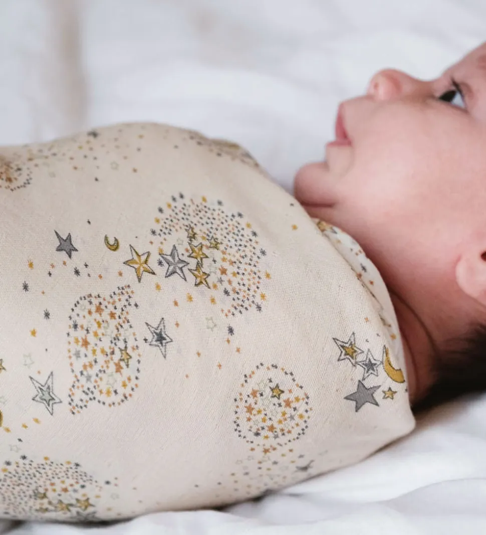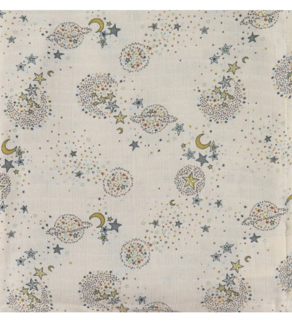 Charmerende Thats Mine babysvøb i lysebeige med et smukt mønster af stjerner i forskellige farver. Svøbet har en lækker musselin-struktur.