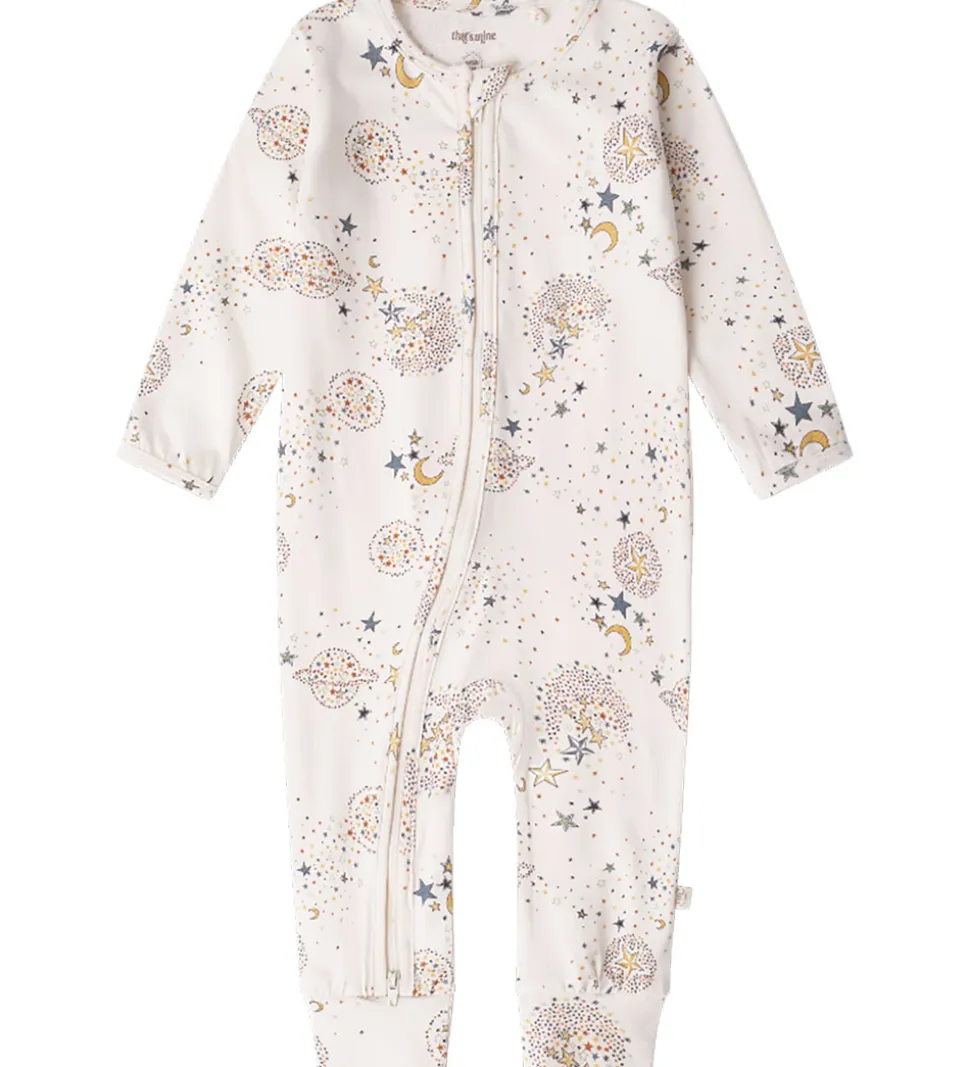 Charmerende Thats Mine heldragt i en cremefarvet nuance med et betagende universprint af stjerner og måner i blå, gule og brune nuancer.