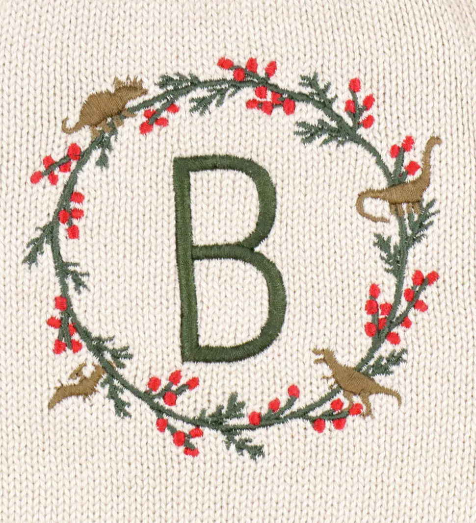 Fin That’s Mine julesok i beige strik med et broderet, grønt “B” og en broderet julekrans i grøn med røde bær og brungrønne dinoer på skaftets ene side. Der er også to pomponer i snor ved julesokken åbning.