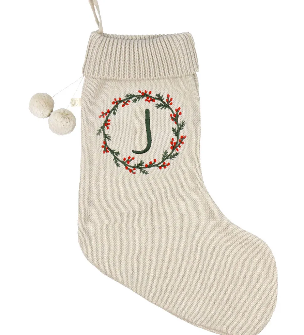 Hyggelig That’s Mine julesok i beige strik med et broderet, grønt “J” og en broderet julekrans i grøn med røde bær på skaftets ene side. Der er også to pomponer i snor ved julesokken åbning.