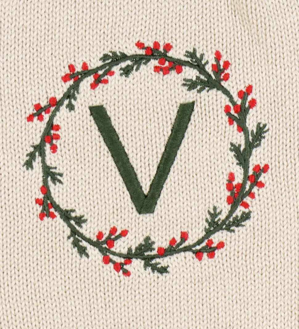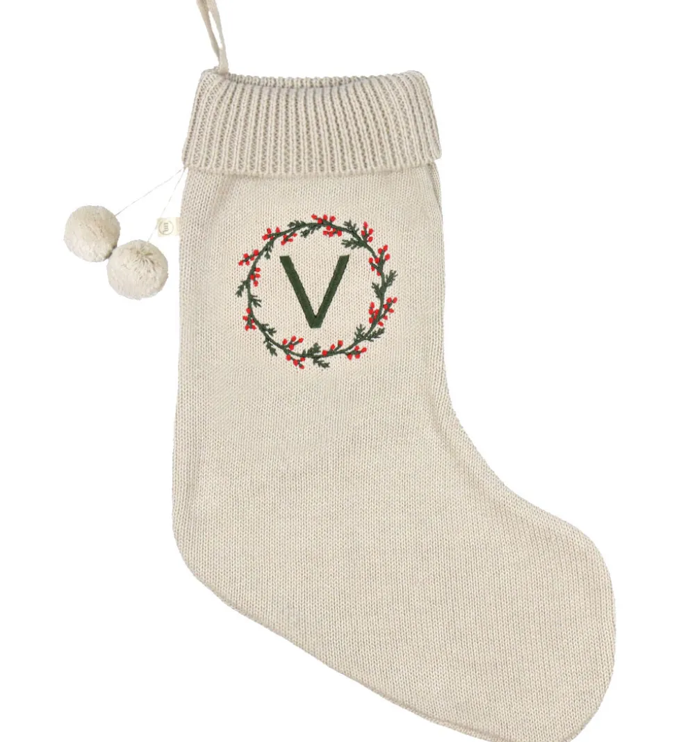 Hyggelig That’s Mine julesok i beige strik med et broderet, grønt “V” og en broderet julekrans i grøn med røde bær på skaftets ene side. Der er også to pomponer i snor ved julesokken åbning.