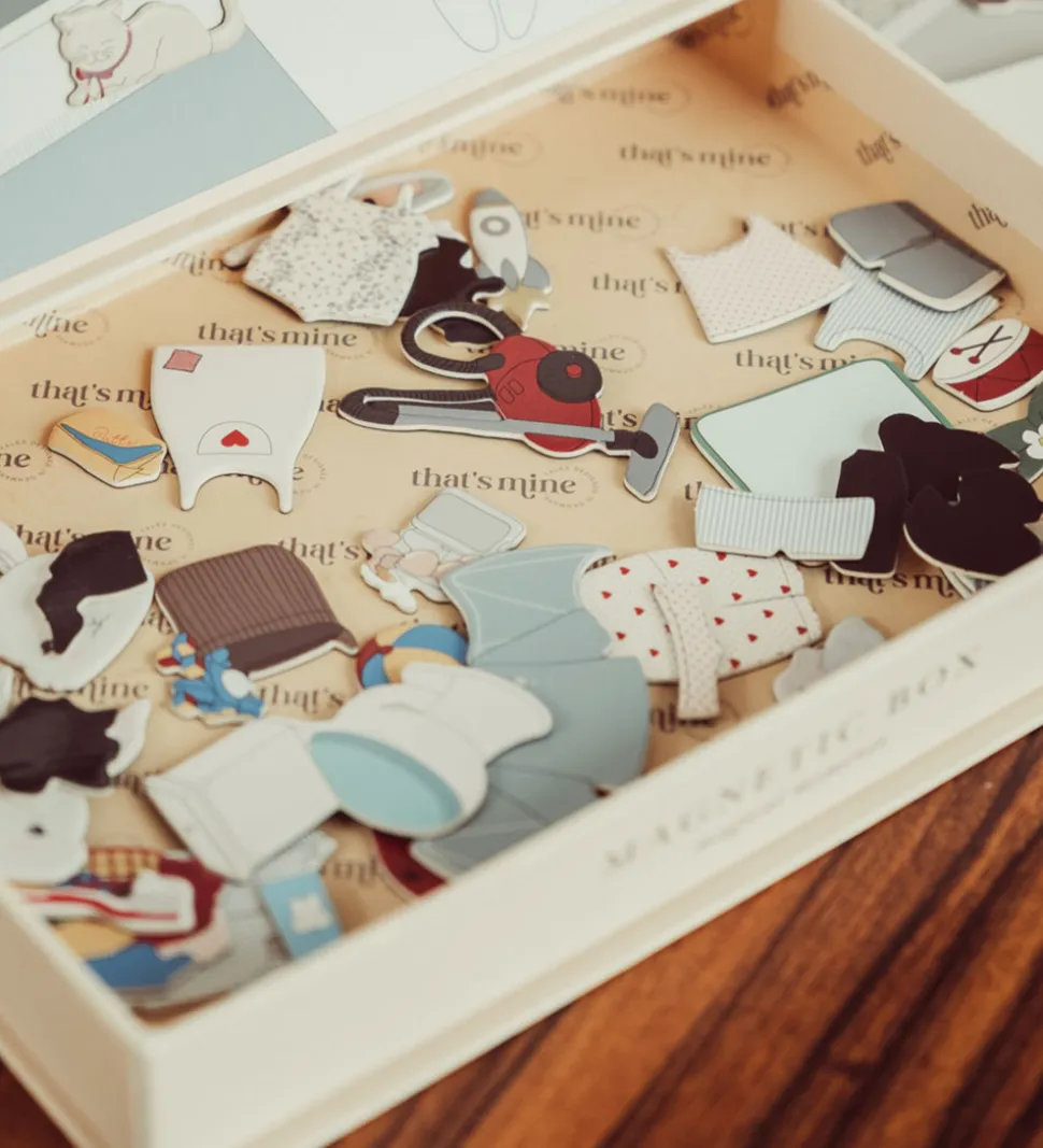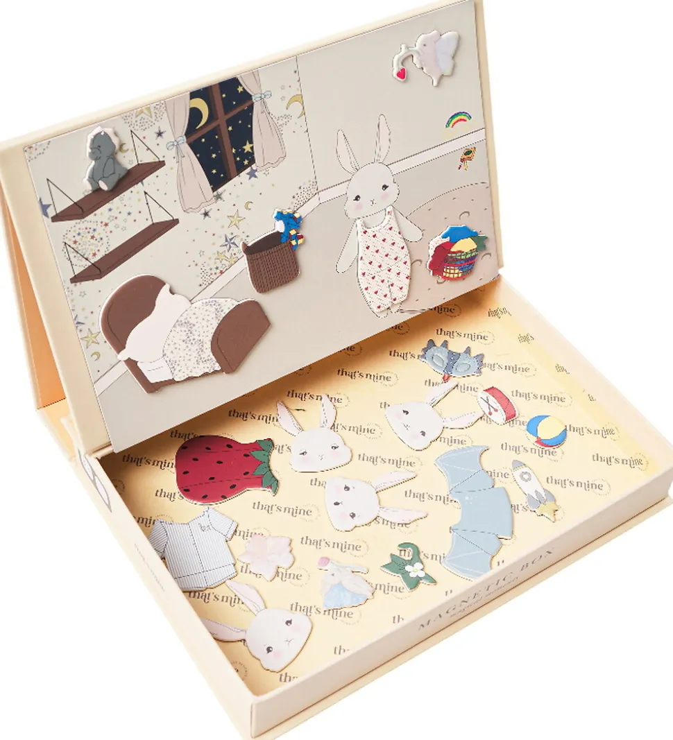 Charmerende Thats Mine magnetisk legebræt med søde illustrationer af en kanin og forskellige hverdagselementer som en tandbørste og en bamse. Thats Mine magnetlegetøjet inspirerer til kreative lege og fantasifulde øjeblikke.