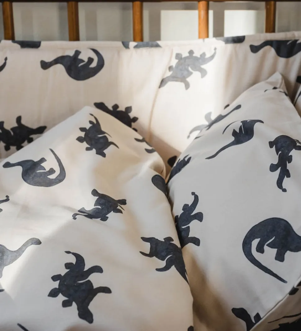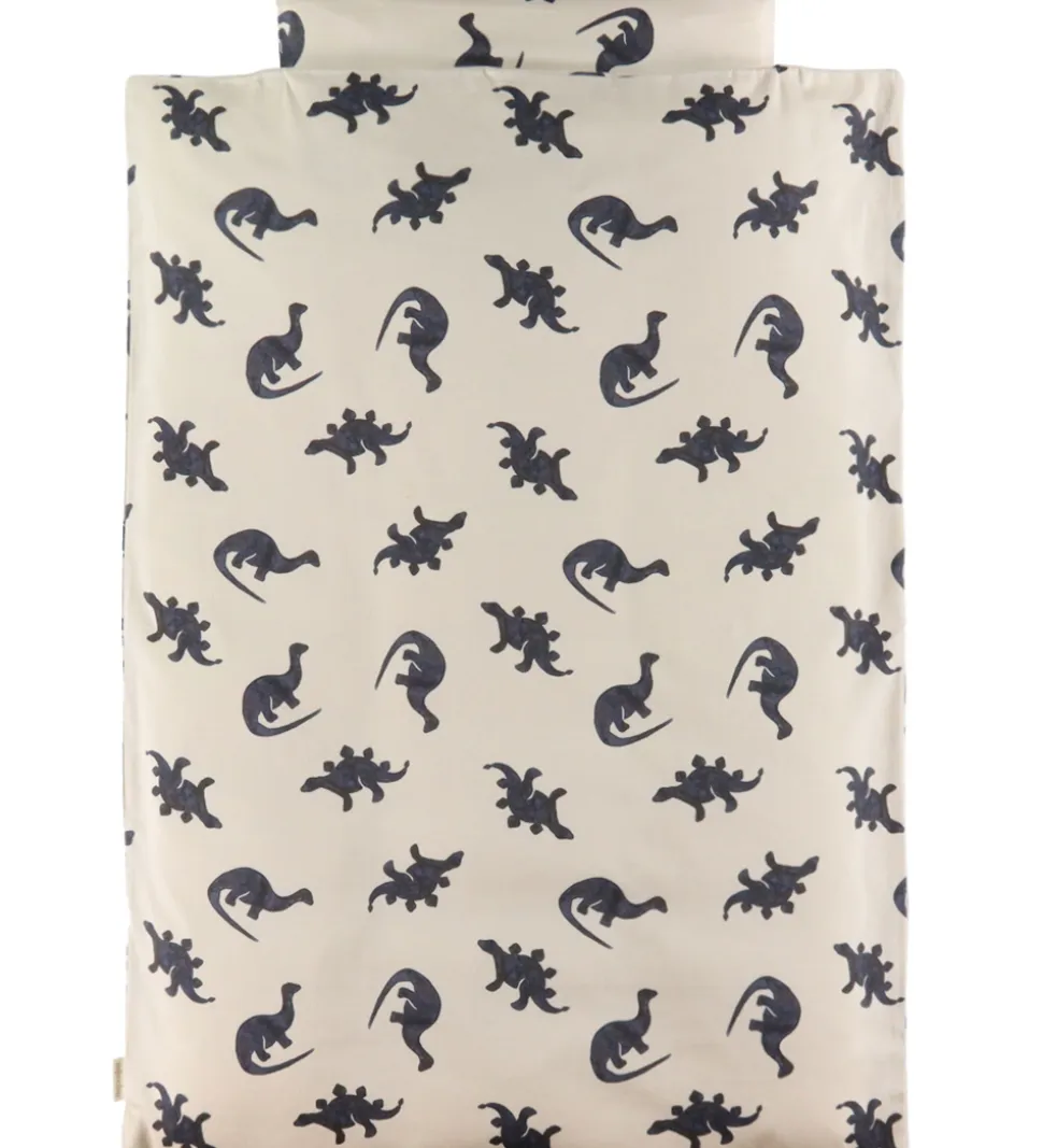 Lækkert That’s Mine sengetøj i lysebeige med et alloverprint af forskellige dinosaurer i mørkeblå nuancer.