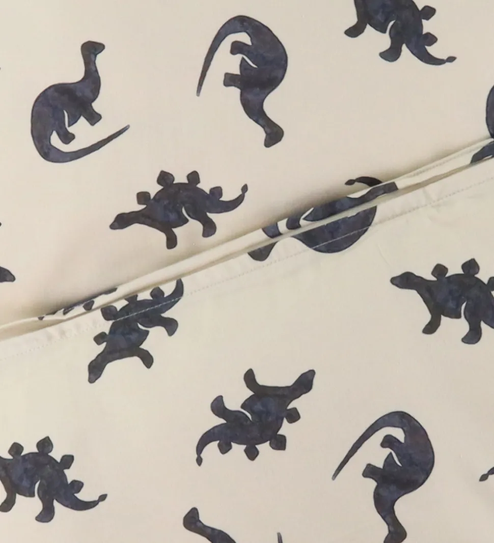 Smart That’s Mine sengetøj i lysebeige med et flot dinosaurprint i mørkeblå nuancer.