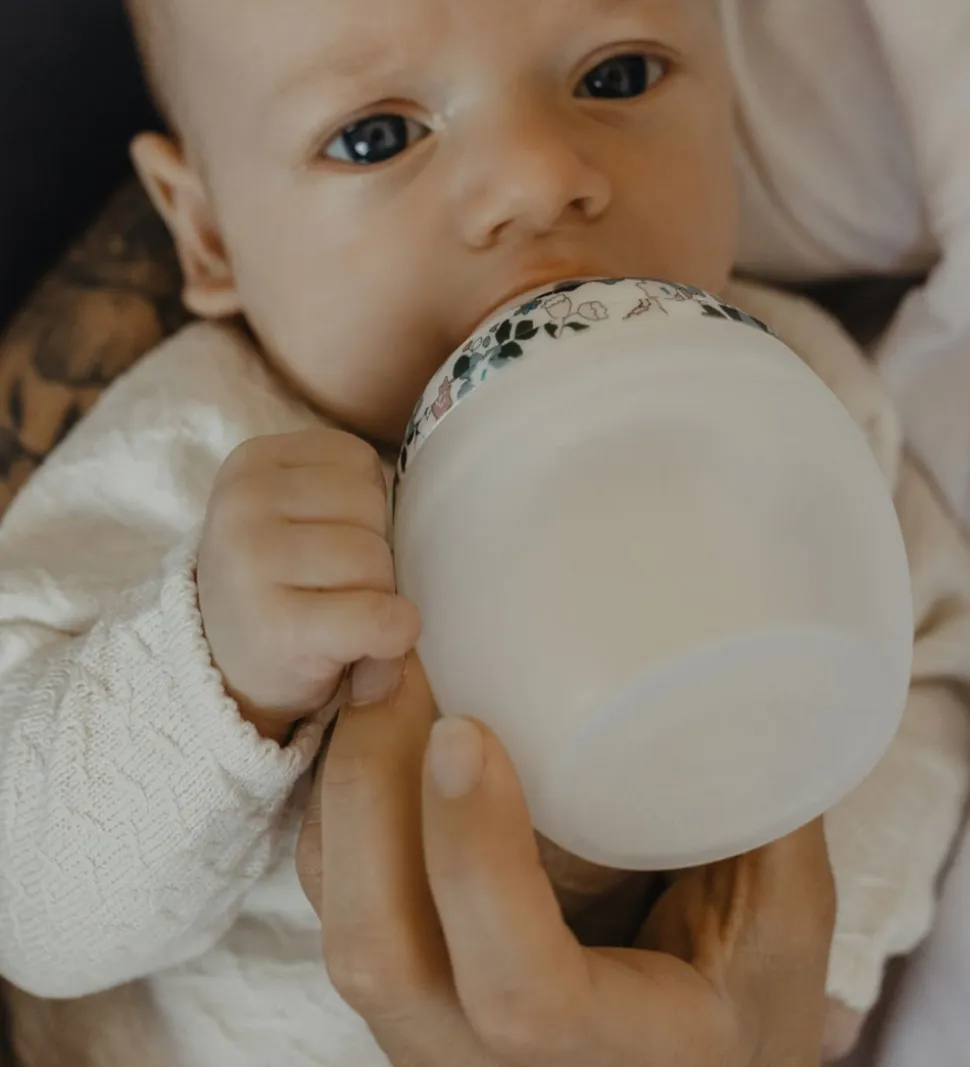Lækker Thats Mine sutteflaske med låg i samarbejde med Élhée i hvid med et smukt blomsterprint.