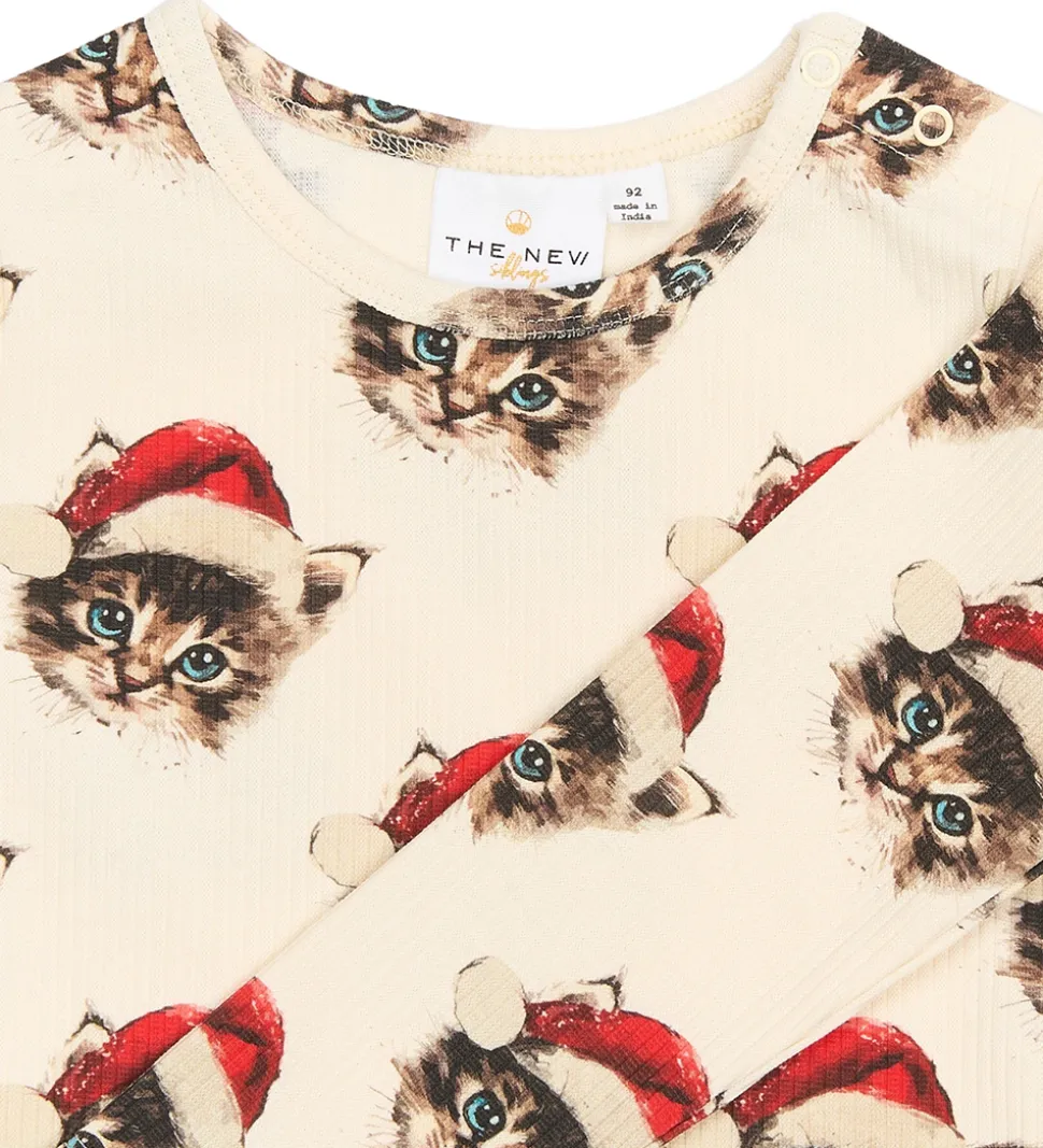 Behageligt nattøj fra The New bestående af en natbluse med lange ærmer og et par natbukser i cremehvid. Nattøjet har et charmerende katteprint, hvor kattene bærer nissehuer. The New nattøjet kombinerer hygge og stil.