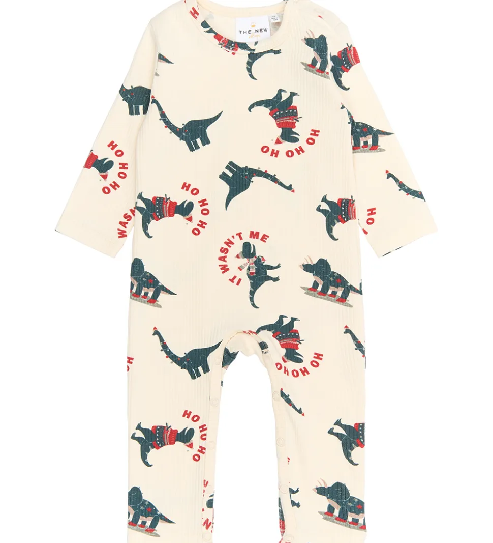 Charmerende heldragt fra The New Siblings i cremehvid med et sjovt dinosaurprint. Printet har forskellige motiver med tekster som “HO HO HO” og “WASN’T ME”.