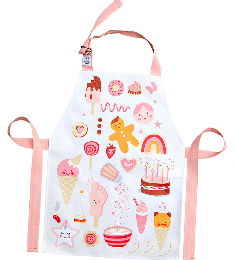 Fint ThreadBear forklæde i beige med rosa stropper og med et sødt print i rosa nuancer af kager og lækkerier.