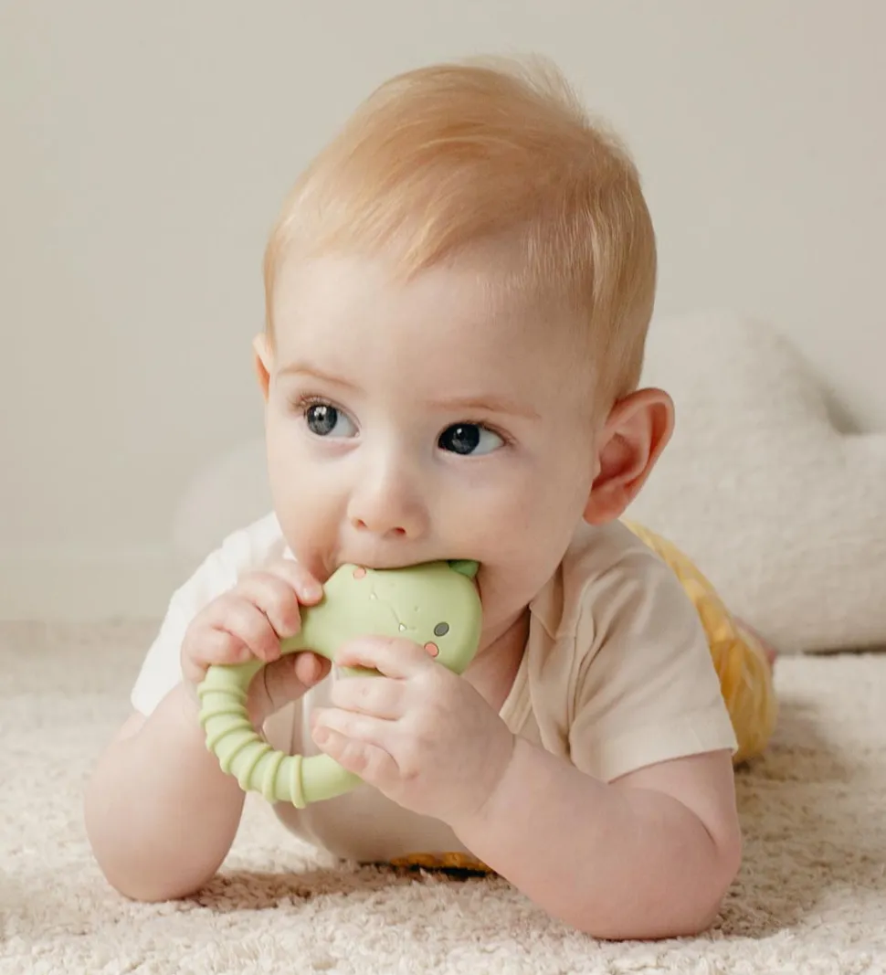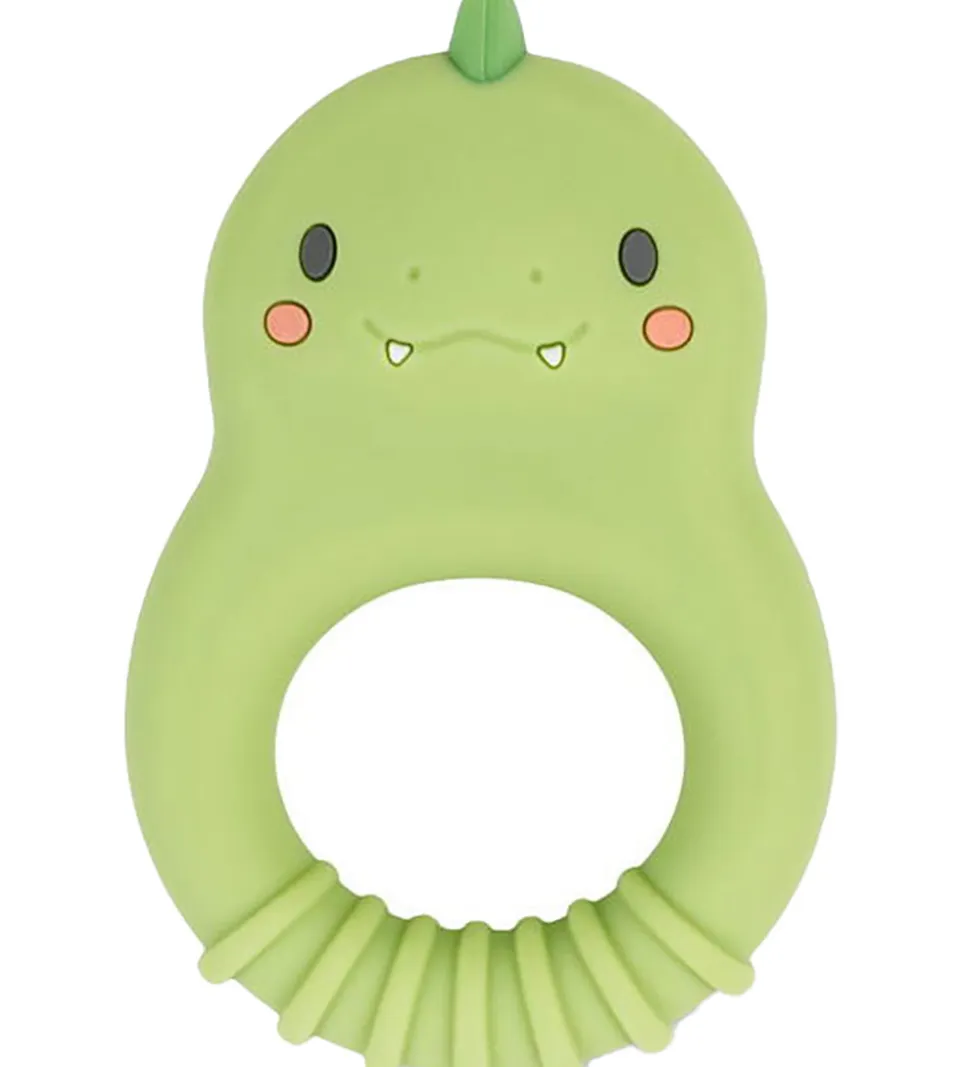 Fin Tiger Tribe bidering i lysegrøn silikone med en rund form med et dinosaurhoved på toppen. Ranglen har et sødt og praktisk design, som er let for barnet at gribe om. Silikonen er behagelig at bide i for ømme gummer.