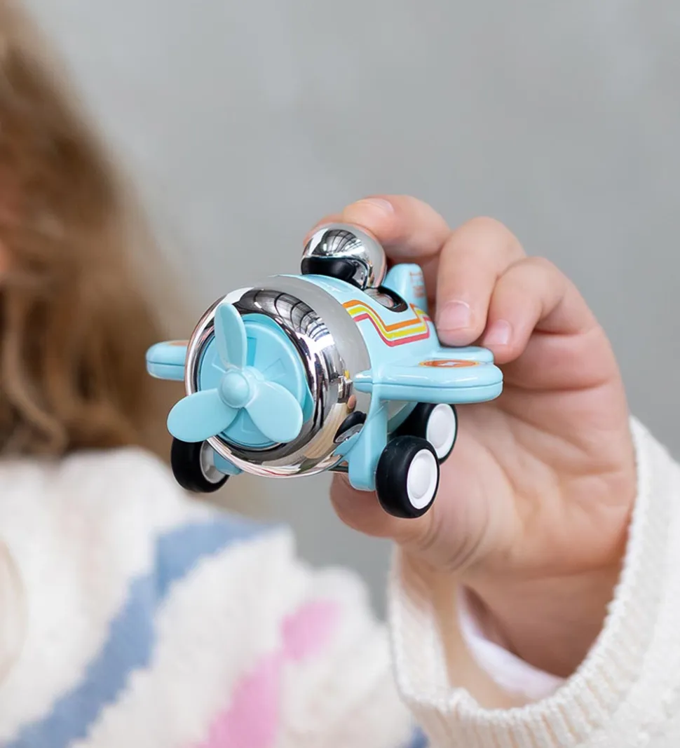 Flot Tiger Tribe flyvemaskine i lyseblå med detaljer i sølv og flerfarvet stribemønster. Flyvemaskinen “Lofty” kan køre (ikke flyve), når man trykker piloten på hovedet, og bruger ikke batteri.
