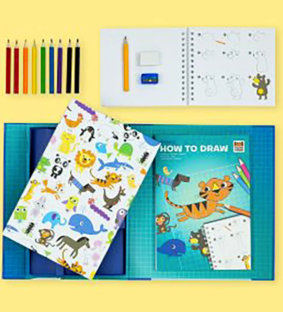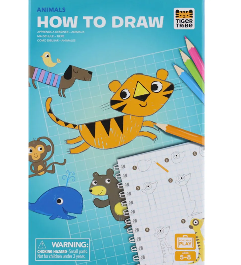 Tiger Tribe tegnesættet lærer dig at tegne flotte tegninger. Det består af en praktisk opbevaringsæske med en blyant samt 9 farveblyanter, et viskelæder og en blyantspidser, en bog med trin for trin-vejledninger til 24 forskellige dyr samt en ternet skitseblok med 36 sider.