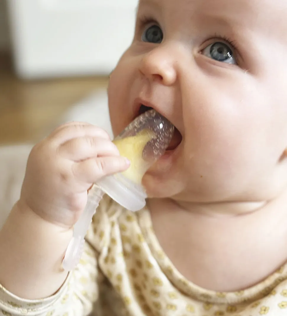 Food feederen sikrer et naturligt flow af mad, som barnet selv har mulighed for at trykke ud, og dermed reduceres spildet af mad og spildt mad på tøjet. Food feederen kan både bruges til mad, frugter osv., men den kan også fyldes med mælk, vand mm. og kommes i fryseren.