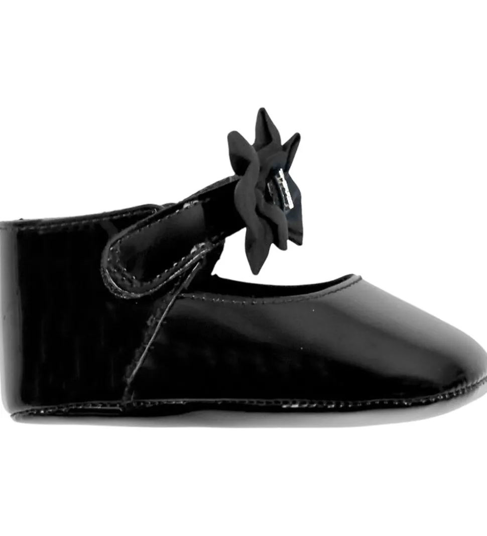 Yndige Tommy Hilfiger ballerina hjemmesko i sort, imiteret laklæder. Fortil er der en sort sløjfe og en logoapplikation i guld.