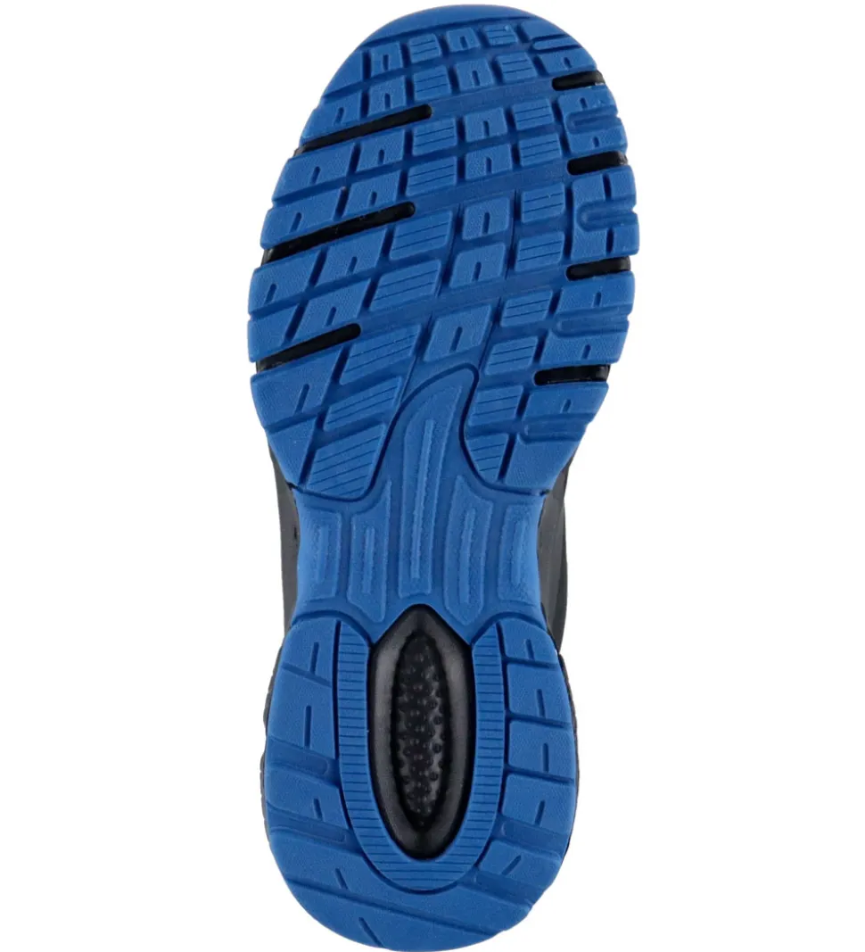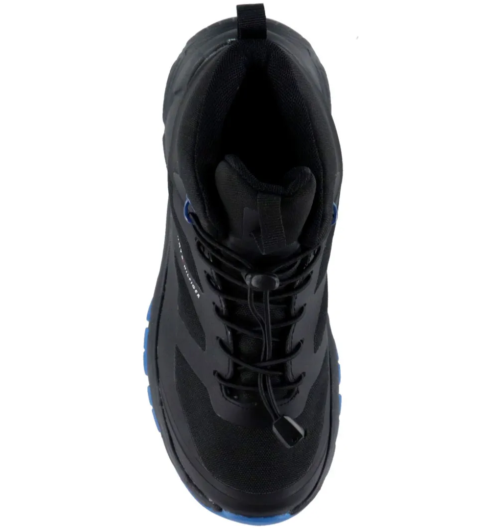 Praktiske Tommy Hilfiger støvler i sort tekstil og imiteret skind. Støvlerne har blå ydersåler og et lille logo på ydersiden.