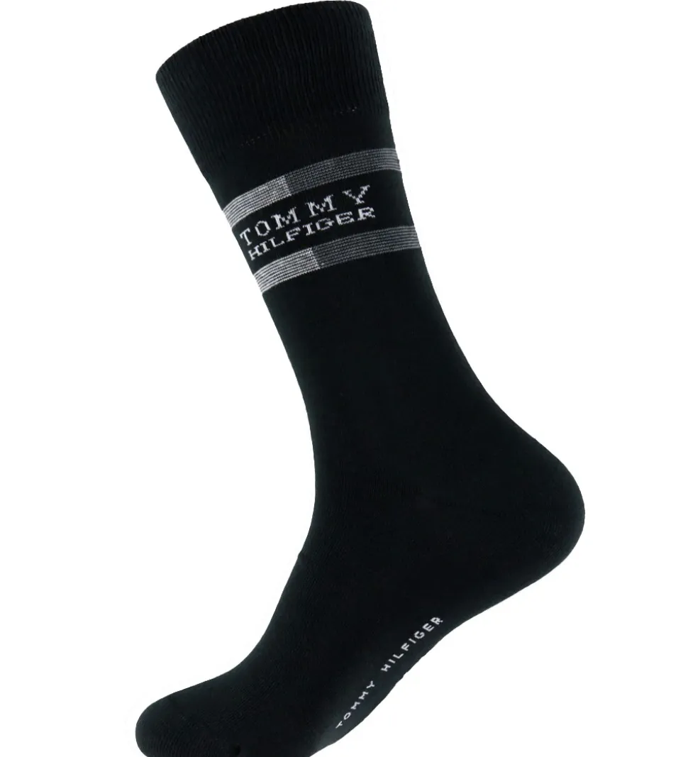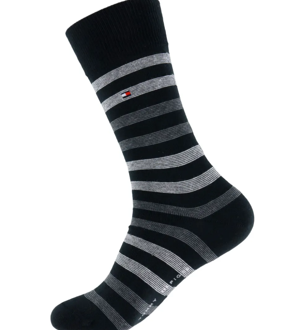 Stilfulde Tommy Hilfiger strømper solgt i en 3-pak. Pakken indeholder to par sorte strømper med små logoer og et par med vandrette grå striber og logo. Strømperne har en ribkant øverst og Tommy Hilfiger branding på undersiden af foden.